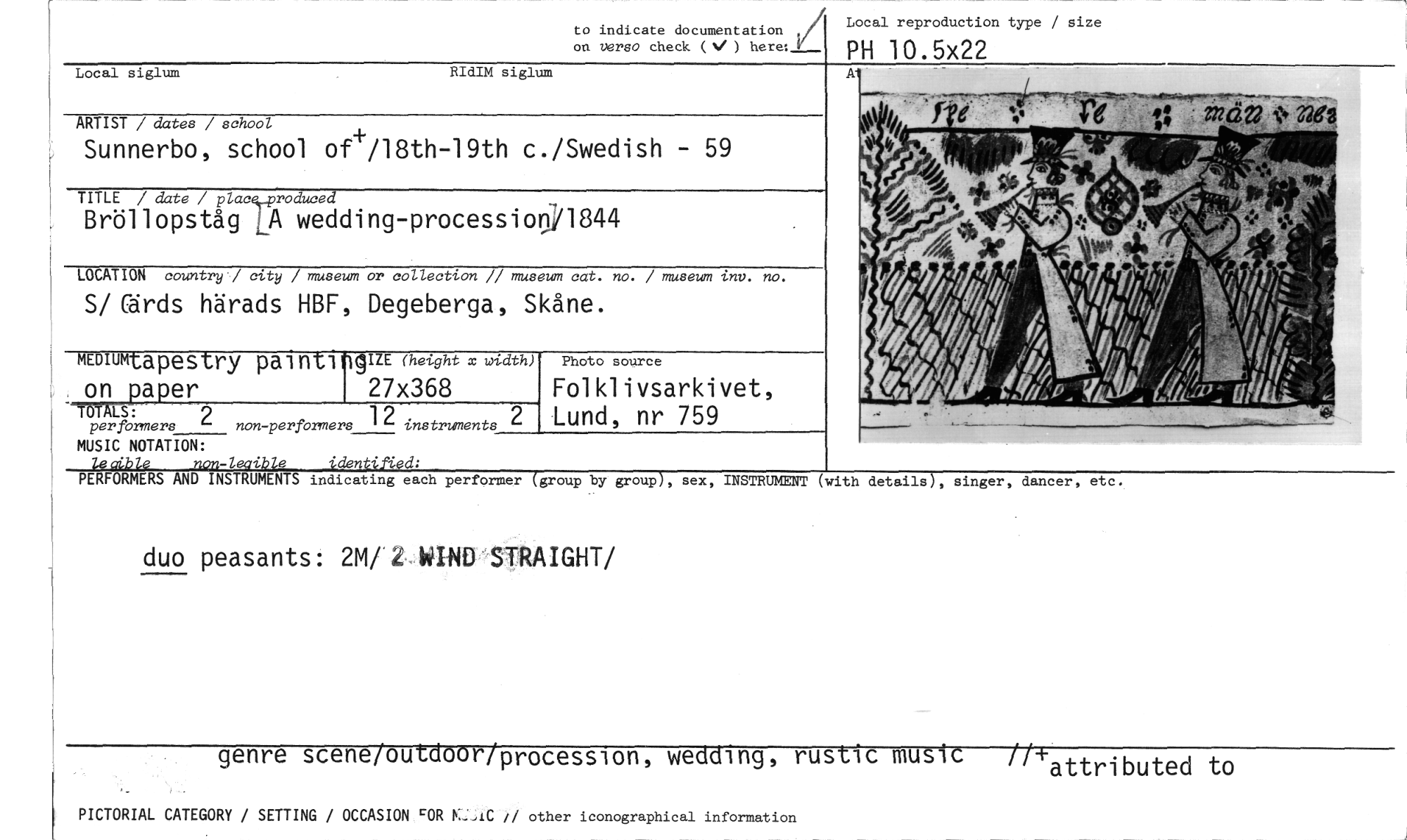 //// Local reproduction type / size //// to indicate documentation , on verso check (%, ) here:_ //// Local siglum RIdIM siglum //// ARTIST / dates / school //// Sunnerbo, school of+/18th-19th c./Swedish - 59 //// TITLE / date / place„produced //// Bröllopståg LA wedding-processio01844 //// mala country ../ city / museum or collection // museum ca. no. / museum inv. no. //// S/Cärds härads HBF, Degeberga, Skåne. //// Photo source //// Folklivsarkivet, Lund, nr 759 //// MEDIUM-t apestry painti InizE (height x width) //// per formers 2 non-performers 1 2 instruments MUSIC NOTATION: //// non-leaible //// pR1P±r 27x368 //// T LS: //// PH 10.5x22 //// - //// 272ä22• 32e2 //// PERFORMERS AND INSTRUMENTS indicating each performer (group by group), sex, INSTRUMENT (with details), singer, dancer, etc. //// duo peasants: 2M/ 2. IND'STRAIGHT/ //// genre scene/outdoor/procession, wedding, rustic music //+attributed to //// PICTORIAL CATEGORY / SETTING / OCCASION rOR Kj,IC il other iconographical information ////