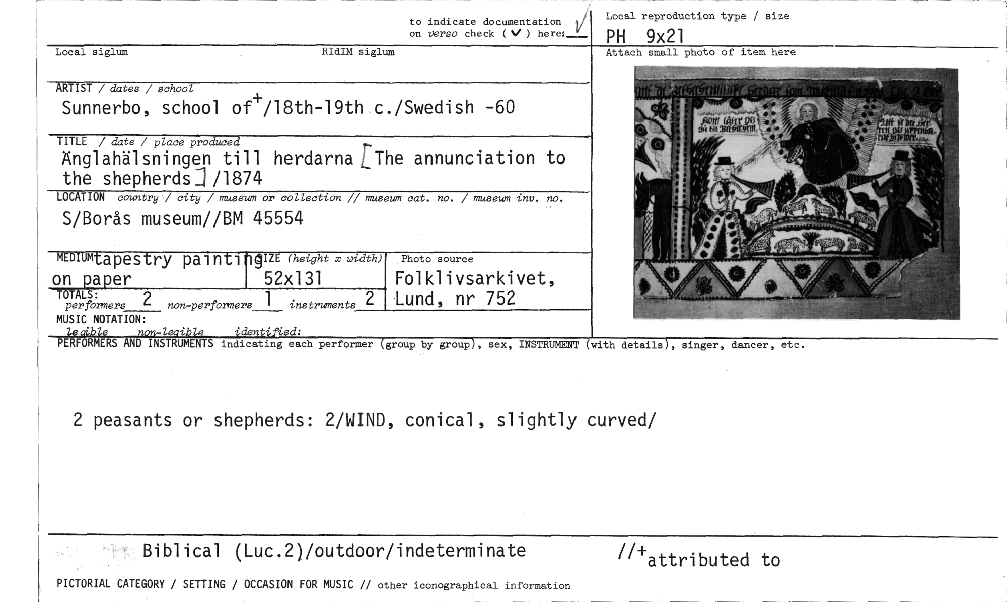 //// to indicate documentation //// on verso check (V ) here: //// Local reproduction type size //// PH 9x21 //// Local siglum RIdIM siglum //// Attach small photo of item here //// ARTIST / dates / school //// Sunnerbo, school of+/18th-19th c./Swedish -60 //// TITLE / date / place produced //// Änglahälsningen till herdarna LThe annunciation to the shepherdsj /1874 //// LOCATION country / city / museum or collection // museum cat. no. / museum inv. no. //// S/Borås museum//BM 45554 //// MEM" apestry painti on •aper AIZE (height x width) Photo source //// 52x131 Folklivsarkivet, Lund, nr 752 //// TOTAS: 2 non-performers instruments //// per formers //// MUSIC NOTATION: //// tecrible non-legible identified: //// PERFORMERS AND INSTRUMENTS indicating each performer (group by group), sex, INSTRUMENT (with details), singer, dancer, etc. //// 2 peasants or shepherds: 2/WIND, conical, slightly curved/ //// Biblical (Luc.2)/outdoor/indeterminate "+attributed to //// PICTORIAL CATEGORY / SETTING / OCCASION FOR MUSIC // other iconographical information ////
