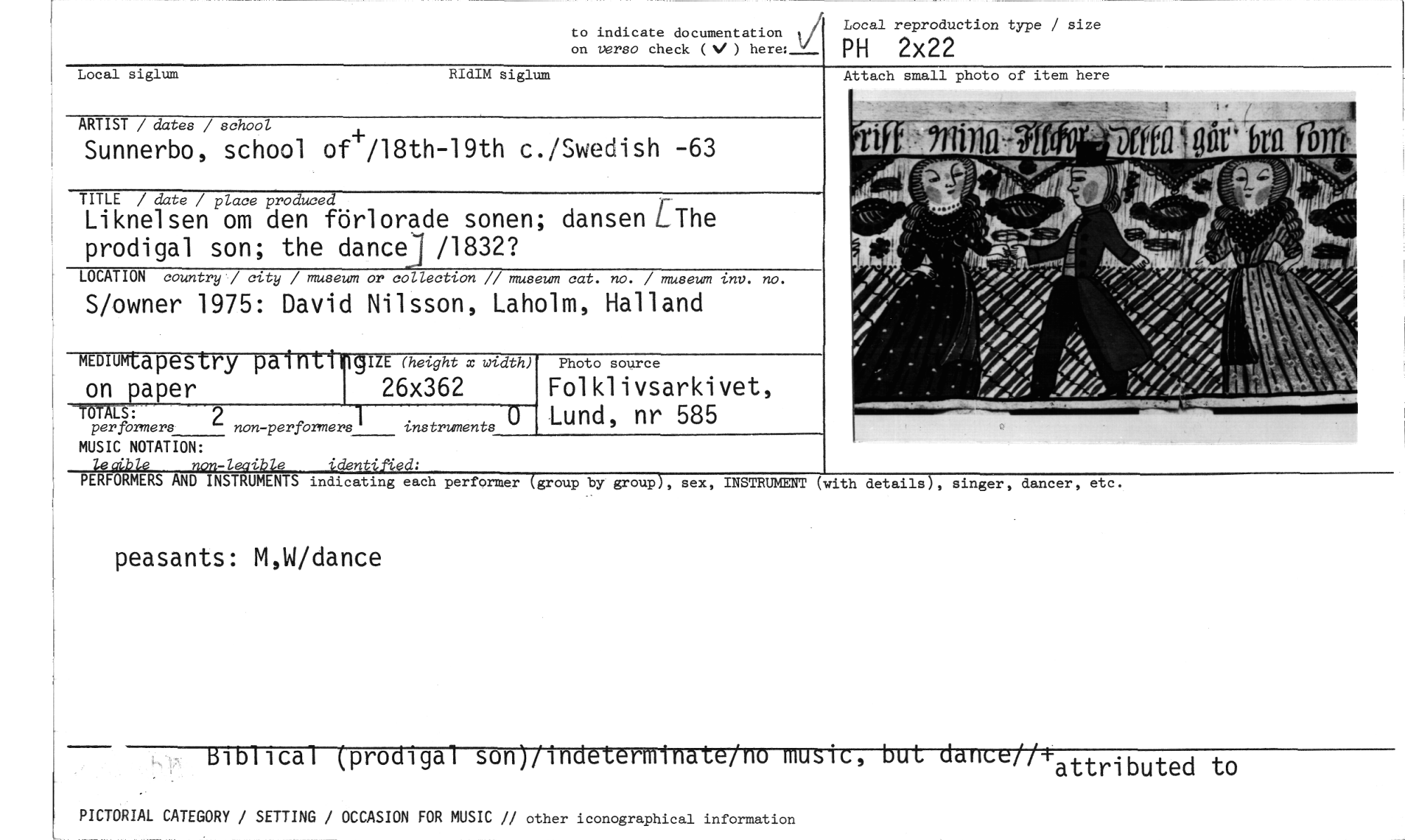 //// to indicate documentation //// on verso check (N/ ) here:" //// Local reproduction type / size //// PH 2x22 //// Local siglum RIdIM siglum //// ARTIST / dates / school //// Sunnerbo, school of+/18th-19th c./Swedish -63 //// TITLE / date / place produced //// Liknelsen om den förlorade sonen; dansen LThe prodigal son; the dance] /1832? //// //// MEDIUMt apestry paint on caper TZE (height x width) Photo source //// 26x362 Folklivsarkivet, Lund, nr 585 //// LS: 2 non-performers instruments //// per formers //// MUSIC NOTATION: //// te‘ible non-leaible identified: //// LOCATION country / city / museum or collection // museum cat. no. / museum inv. no. //// S/owner 1975: David Nilsson, Laholm, Halland //// Attach small photo of item here //// PERFORMERS AND INSTRUMENTS indicating each performer (group by group), sex, INSTRUMENT (with details), singer, dancer, etc. //// peasants: M,W/dance //// biblical (prodigal son)/indetermtnattrfio music, but dame //*attributed to //// PICTORIAL CATEGORY / SETTING / OCCASION FOR MUSIC // other iconographical information ////
