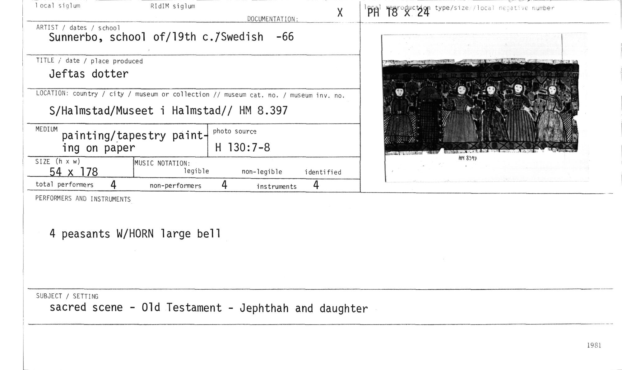 //// l ocal siglum RIdIM siglum //// DOCUMENTATION: //// ARTIST / dates / school //// Sunnerbo, school of/19th c.7Swedish -66 //// TITLE / date / place produced //// Jeftas dotter //// LOCATION: country / city / museum or collection // museum cat. no. / museum inv. no. //// S/Halmstad/Mus eet i Halmstad// HM 8.397 //// MEDIUM //// painting/tap estry painting on paper //// MUSIC NOTATION: //// legible non-legible identified //// total performers 4 non-performers 4 instruments 4 //// PERFORMERS AND INSTRUMENTS //// 4 peasants W/HORN large bell //// X pil IsIrg type/size//local negative nutuber //// SIZE (h x w) //// 54 //// x 178 //// photo source //// H 130:7-8 //// SUBJECT / SETTING //// sacred scene - Old Testament - Jephthah and daughter //// 1981 ////