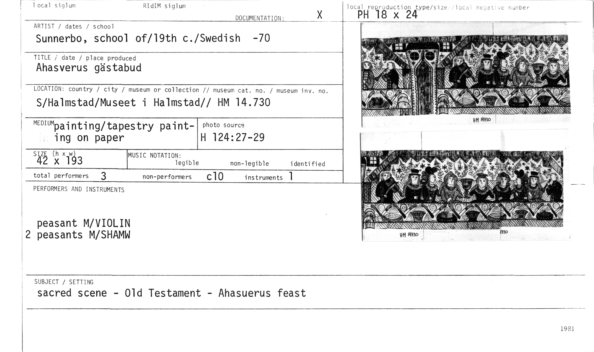 //// PERFORMERS AND INSTRUMENTS //// noneNTNgt% ,7 son7\ //// peasant M/VIOLIN 2 peasants M/SHAMW //// 1930 //// [1 otal siglum RIdIM siglum //// DOCUMENTATION: //// ARTIST / dates / school //// Sunnerbo, school of/19th c./Swedish -70 //// lotal reproduction type/size /lotal negative munter //// PH 18 x 24 //// TITLE / date / place produced //// Ahasverus gästabud //// LOCATION: country / city / museum or collection // museum cat. no. / museum inv. no. //// S/Halmstad/Museet i Halmstad// HM 14.730 //// ing/tapestry painting on paper //// photo source //// H 124:27-29 //// sz (1)h< xlwå3 //// total performers 3 //// MUSIC NOTATION: //// legible non-legible i denti fied //// non-performers Cl 0 instruments 1 //// SUBJECT / SETTING //// sacred scene - Old Testament - Ahasuerus feast //// 1981 ////