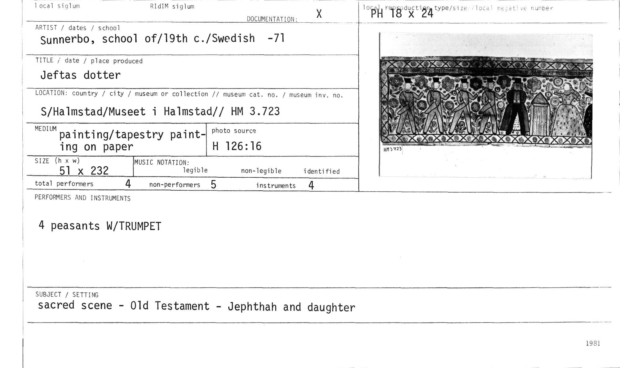 //// 4 peasants W/TRUMPET //// SUBJECT / SETTING //// sacred scene - Old Testament - Jephthah and daughter //// 1 ocal siglum //// RIdIM siglum //// DOCUMENTATION : //// rapHducXtihnA type/s i ze I ocal nec:ati noter //// I 0 LLI //// x //// ARTIST / dates / school //// Sunnerbo, school of/19th c./Swedish -71 //// TITLE / date / place produced //// Jeftas dotter //// LOCATION: country / city / museum or collection // museum cat. no. / museum inv. no. //// S/Halmstad/Museet i Halmstad// HM 3.723 //// MEDIUM //// painting/tapestry painting on paper //// photo source //// H 126:16 //// HM3123'- //// Rp //// tålls sra //// MICAVOIC.I.C>1.7)::AMICK.()IfIKOICEIC) //// SIZE (h x w) //// 51 x 232 //// total performers //// PERFORMERS AND INSTRUMENTS //// MUSIC NOTATION: //// legible //// non-legible i denti fied //// 4 non-performers 5 instruments //// 1981 ////