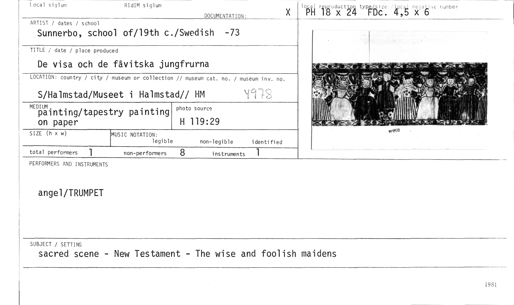 //// lotal siglum RIdIM siglum //// DOCUMENTATION: //// ARTIST / dates / school //// Sunnerbo, school of/19th c./Swedish -73 //// TITLE / date / place produced //// De visa och de fåvitska jungfrurna //// LOCATION: country / city / museum or collection // museum cat. no. / museum inv. no. //// S/Halmstad/Mus //// MEDIUM //// painting/tapes on paper //// SIZE (h x w) //// MUSIC NOTATION: //// legible non-legible identified //// loisfi woductkyi typgkieze,,lecig negak)ve nurober //// iö [4 ru. 49U U //// PERFORMERS AND INSTRUMENTS //// angel/TRUMPET //// total performers 1 non-performers 8 instruments 1 //// eet i Halmstad// HM try painting //// photo source //// H 119:29 //// SUBJECT / SETTING //// sacred scene - New Testament - The wise and foolish maidens //// 1981 ////
