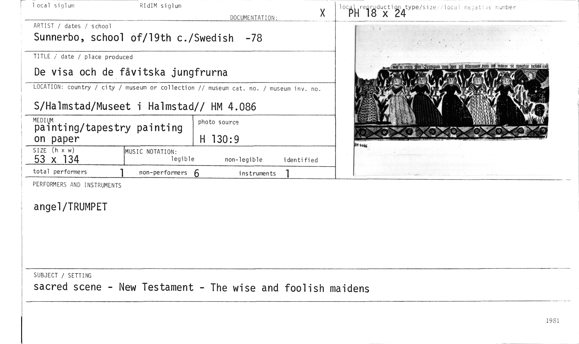 //// r_ //// i 1 ocal siglum //// RIdIM siglum //// DOCUMENTATION: //// ux loct4IreQ1ductior4 type/size //// local nezatvc nurober //// ARTIST / dates / school //// Sunnerbo, school of/19th c./Swedish -78 //// TITLE / date / place produced //// wOunoinfonn,oi. //// nom. lon o‘t //// De visa och de fåvitska jungfrurna //// LOCATION: country / city / museum or collection // museum cat. no. / museum inv. no. //// S/Halmstad/Museet i Halmstad// HM 4.086 //// MEDIUM //// painting/tapestry painting on paper //// photo source //// H 130:9 //// SIZE (h x w) //// 53 x 134 //// MUSIC NOTATION: //// legible //// non-legible identified //// total performers //// non-performers 6 instruments //// 1 //// PERFORMERS AND INSTRUMENTS //// angel/TRUMPET //// SUBJECT / SETTING //// sacred scene - New Testament - The wise and foolish maidens //// 1981 ////