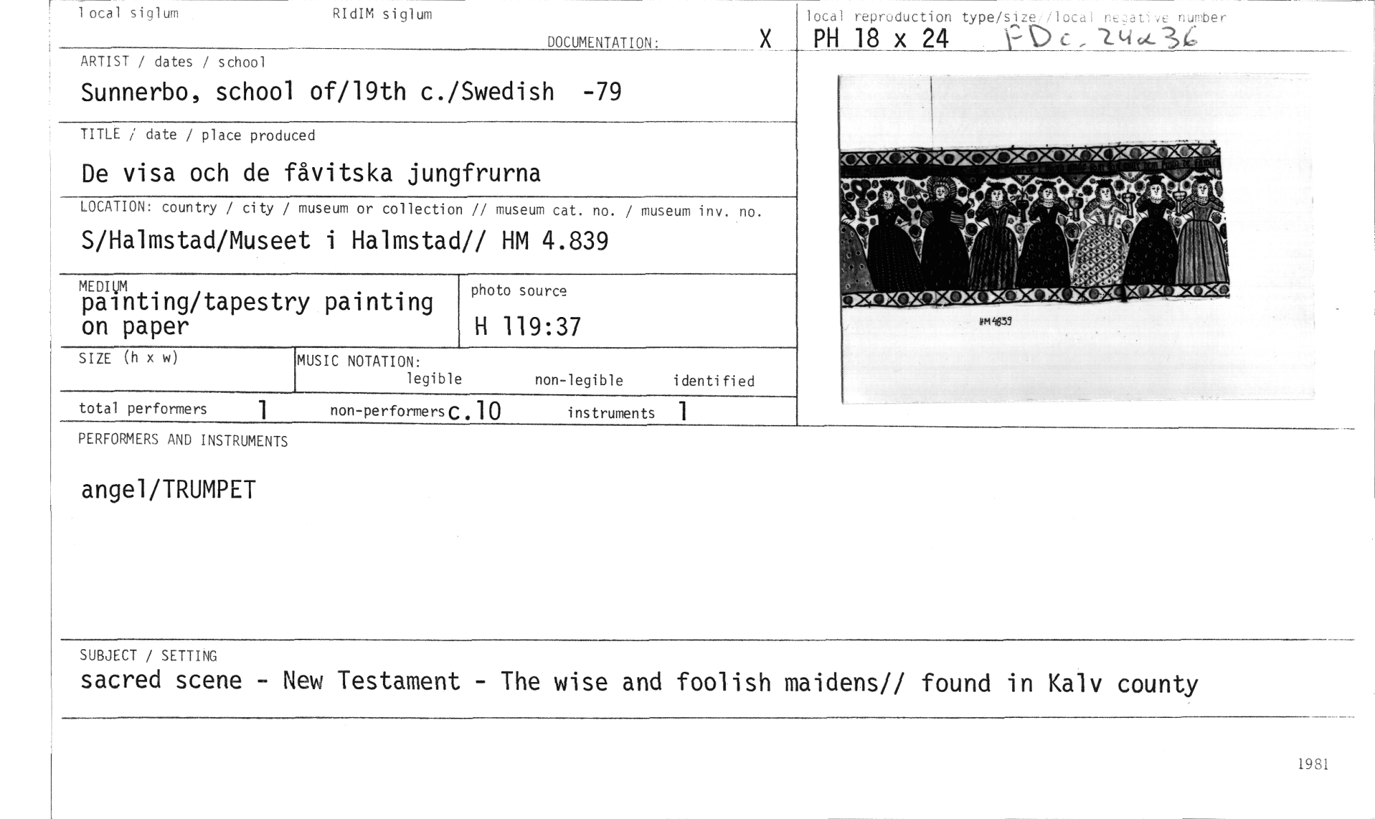//// 1 otal siglum RIdIM siglum //// DOCUMENTATION: //// ARTIST / dates / school //// Sunnerbo, school of/l9th c./Swedish -79 //// lotal reproduction typeze//local negatve number //// PH 18 x 24 • \=D c.. 24.4-34 //// MUSIC NOTATION: //// legible //// instruments //// mmum //// painting/tapestry painting //// on paper //// SIZE (h x w) //// photo source //// H 119:37 //// non-legible identified //// total performers 1 non-performers C 10 //// PERFORMERS AND INSTRUMENTS //// TITLE / date / place produced //// De visa och de fåvitska jungfrurna //// LOCATION: country / city / museum or collection // museum cat. no. / museum inv. no. //// S/Halmstad/Museet i Halmstad// HM 4.839 //// ca-xx-yfayamagy2-yx-yncxx.,25x), //// ›xxon,TIxiwismIll!ai //// angel/TRUMPET //// SUBJECT / SETTING //// sacred scene - New Testament - The wise and foolish maidens// found in Kalv county //// 1981 ////