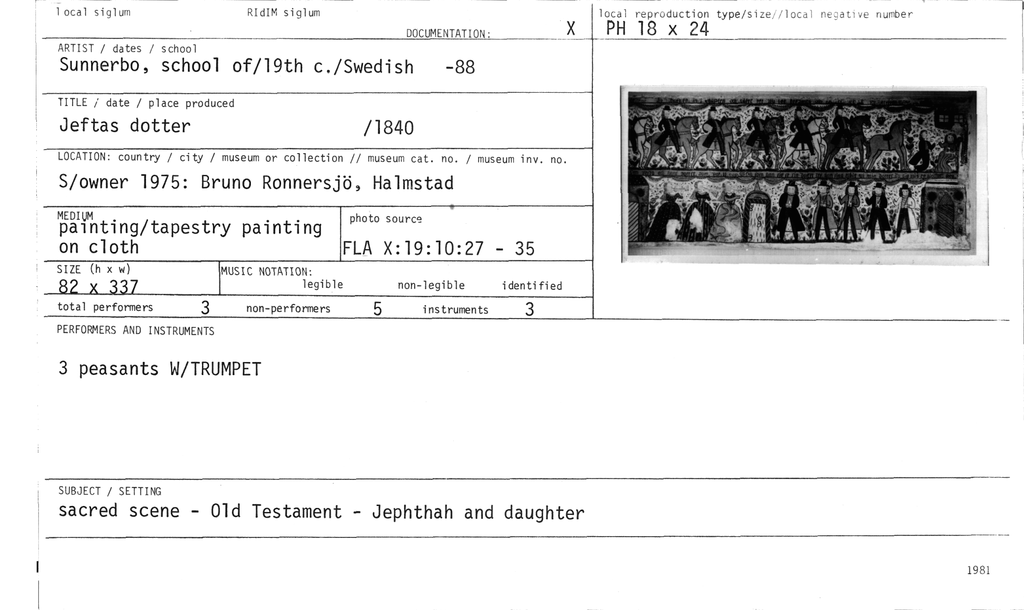 //// lotal siglum RIdIM siglum //// DOCUMENTATION: //// ARTIST / dates / school //// Sunnerbo, school of/19th c./Swedish -88 //// TITLE / date / place produced //// Jeftas dotter /1840 //// LOCATION: country / city / museum or collection // museum cat. no. / museum inv. no. //// S/owner 1975: Bruno Ronnersjö, Halmstad //// Kom //// painting/tapestry painting //// on cloth //// lotal reproduction type/sizei/local negative number //// PH 18 x 24 //// photo source //// FLA X:19:10:27 - 35 //// SIZE (h x w) MUSIC NOTATION: non-legible identified //// 82 x 337 legible //// //// total performers 3 non-performers instruments 3 //// PERFORMERS AND INSTRUMENTS //// 3 peasants W/TRUMPET //// SUBJECT / SETTING //// sacred scene - Old Testament - Jephthah and daughter //// 1981 ////