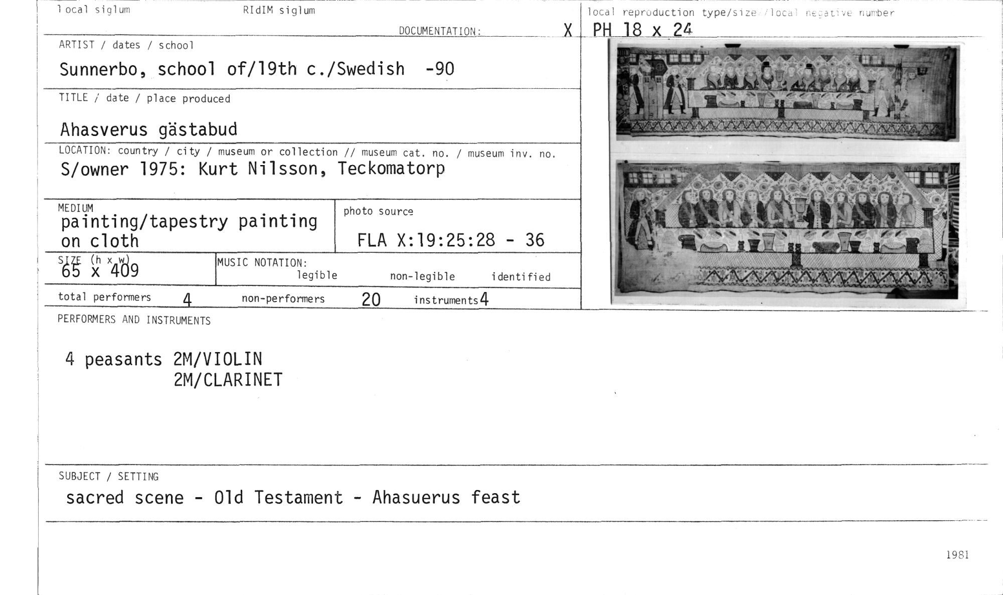 //// 1 otal siglum RIdIM siglum //// DOCUMENTATION: //// ARTIST / dates / school //// Sunnerbo, school of/19th c./Swedish -90 //// TITLE / date / place produced //// Ahasverus gästabud //// LOCATION: country / city / museum or collection // museum cat. no. / museum inv. no. //// S/owner 1975: Ki rt Nilsson, Teckomatorp //// MEDIUM //// painting/tapestry painting on cloth //// MUSIC NOTATION: //// legible non-legible identified //// non-performers 20 i nstruments4 //// Sgg rkwd9 //// photo source //// FLA X:19:25:28 - 36 //// total performers //// 4 //// local reproduction type/size, local negatIve nurober //// X PI-118 x 24 //// '13•"1:141 //// ••• 0/ e //// 111 1 It i ur IN i-- //// PERFORMERS AND INSTRUMENTS //// 4 peasants 2M/VIOLIN //// 2M/CLARINET //// SUBJECT / SETTING //// sacred scene - Old Testament - Ahasuerus feast //// 1981 ////