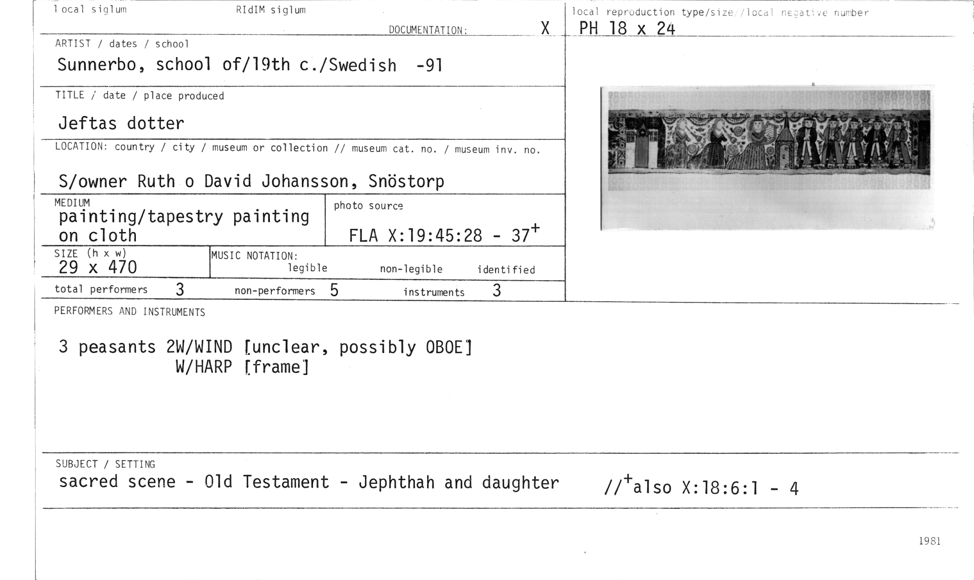 //// iocal siglum RIdIM siglum //// DOCUMENTATION: //// ARTIST / dates / school //// Sunnerbo, school of/19th c./Swedish -91 //// lotal reproduction type/size ilocal neuative number //// PH 18 x 24 //// TITLE / date / place produced //// Jeftas dotter //// LOCATION: country / city / //// S/owner Ruth o avid Johansson, Snöstorp //// MEDIUM //// painting/tapestry painting on cloth //// SIZE (h x w) //// 29 x 470 //// total performers 3 //// PERFORMERS AND INSTRUMENTS //// MUSIC NOTATION: //// legible //// museum or collection // museum cat. no. / museum inv. no. //// photo source //// FLA X:19:45:28 - 37+ //// non-legible identified //// non-performers 5j instruments 3 //// 3 peasants 2W/WIND (unclear, possibly OBOE] W/HARP (frame) //// SUBJECT / SETTING //+also X:18:6:1 - 4 //// sacred scene - Old Testament - Jephthah and daughter //// 1981 ////