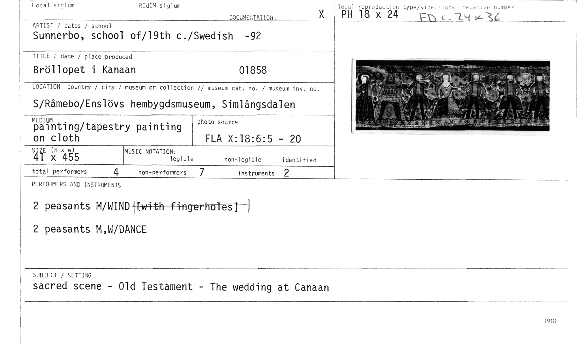 //// 1 ocal siglum RIdIM siglum //// DOCUMENTATION: //// ARTIST / dates / school //// Sunnerbo, school of/19th c./Swedish -92 //// rirgirtAl type/size/ilocal negative nunter //// t C - '14 04 //// TITLE / date / place produced //// Bröllopet i Kanaan 01858 //// LOCATION: country / city / museum or collection // museum cat. no. / museum inv. no. //// S/Råmebo/Enslövs hembygdsmuseum, Simlångsdalen //// MEDIUM //// painting/tapestry painting on cloth //// photo source //// FLA X:18:6:5 - 20 //// 41' (; VE.i5 //// MUSIC NOTATION: //// legible non-legible identified //// total performers //// instruments 2 //// 4 non-performers 7 //// PERFORMERS AND INSTRUMENTS //// 2 peasants M/WIND //// es //// 2 peasants M,W/DANCE //// SUBJECT / SETTING //// sacred scene - Old Testament - The wedding at Canaan //// 1981 ////