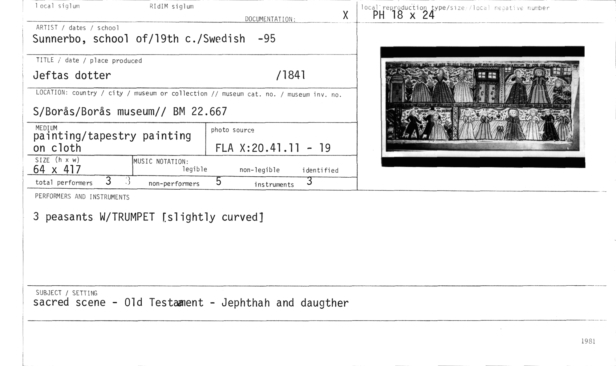//// 1931 //// total performers 3 • //// non-performers 5 instruments 3 //// 1 otal siglum RIdIM siglum //// DOCUMENTATION: //// local'reproduCtion type/size local negative number //// PH. 18 x 24 //// ARTIST / dates / school //// Sunnerbo, school of/19th c./Swedish -95 //// TITLE / date / place produced //// Jeftas dotter /1841 //// LOCATION: country / city / museum or collection // museum cat. no. / museum inv. no. //// S/Borås/Borås museum// BM 22.667 //// MEDIUM //// painting/tapestry painting on cloth //// photo source //// FLA X:20.41.11 - 19 //// MUSIC NOTATION: //// legible //// non-legible identified //// PERFORMERS AND INSTRUMENTS //// 3 peasants W/TRUMPET fslightly turved] //// SUBJECT / SETTING //// sacred scene - Old Testament - Jephthah and daugther //// SIZE (h x w) //// 64 x 417 ////