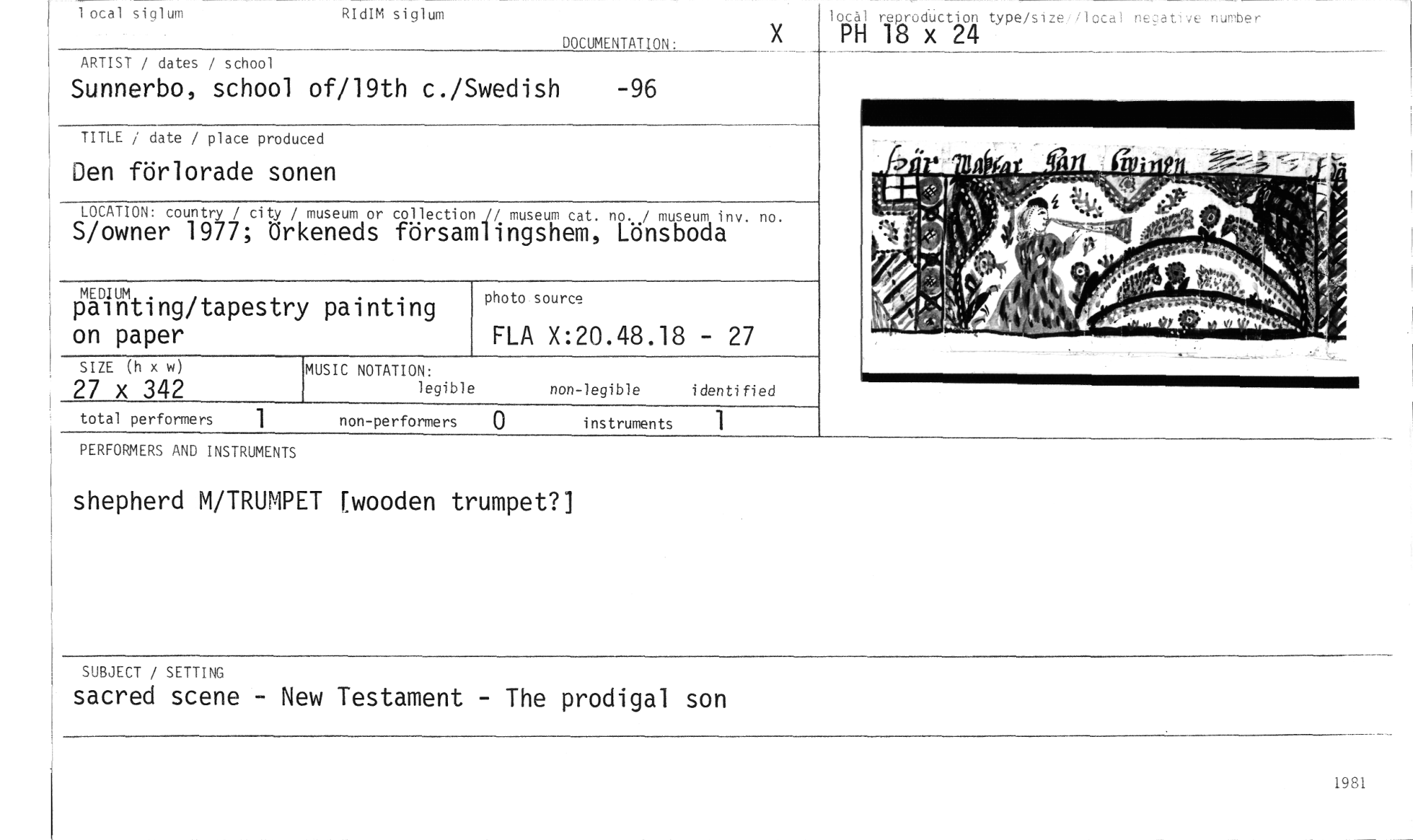 //// 1 otal siglum RIdIM siglum //// DOCUMENTATION: //// lotal reproduction type/sizeillocal negative nurober //// PH 18 x 24 //// ARTIST / dates / school //// Sunnerbo, school of/19th c./Swedish -96 //// TITLE / date / place produced //// Den förlorade sonen //// LOCATION: country / city / museum or collectionll museum cat. no. / museum inv. no. //// S/owner 1977 Ur keneds församlingshem, Lönsboda //// MEDIUM //// painting/tapestry on paper //// painting //// photo source //// FLA X:20.48.18 - 27 //// MUSIC NOTATION: //// legible //// non-legible identified //// SIZE (h x w) //// 27 x 342 //// total performers 1 non-performers 0 instruments 1 //// PERFORMERS AND INSTRUMENTS //// shepherd M/TRUMPET rwooden trumpet?] //// SUBJECT / SETTING //// sacred scene - New Testament - The prodigal son //// 1981 ////