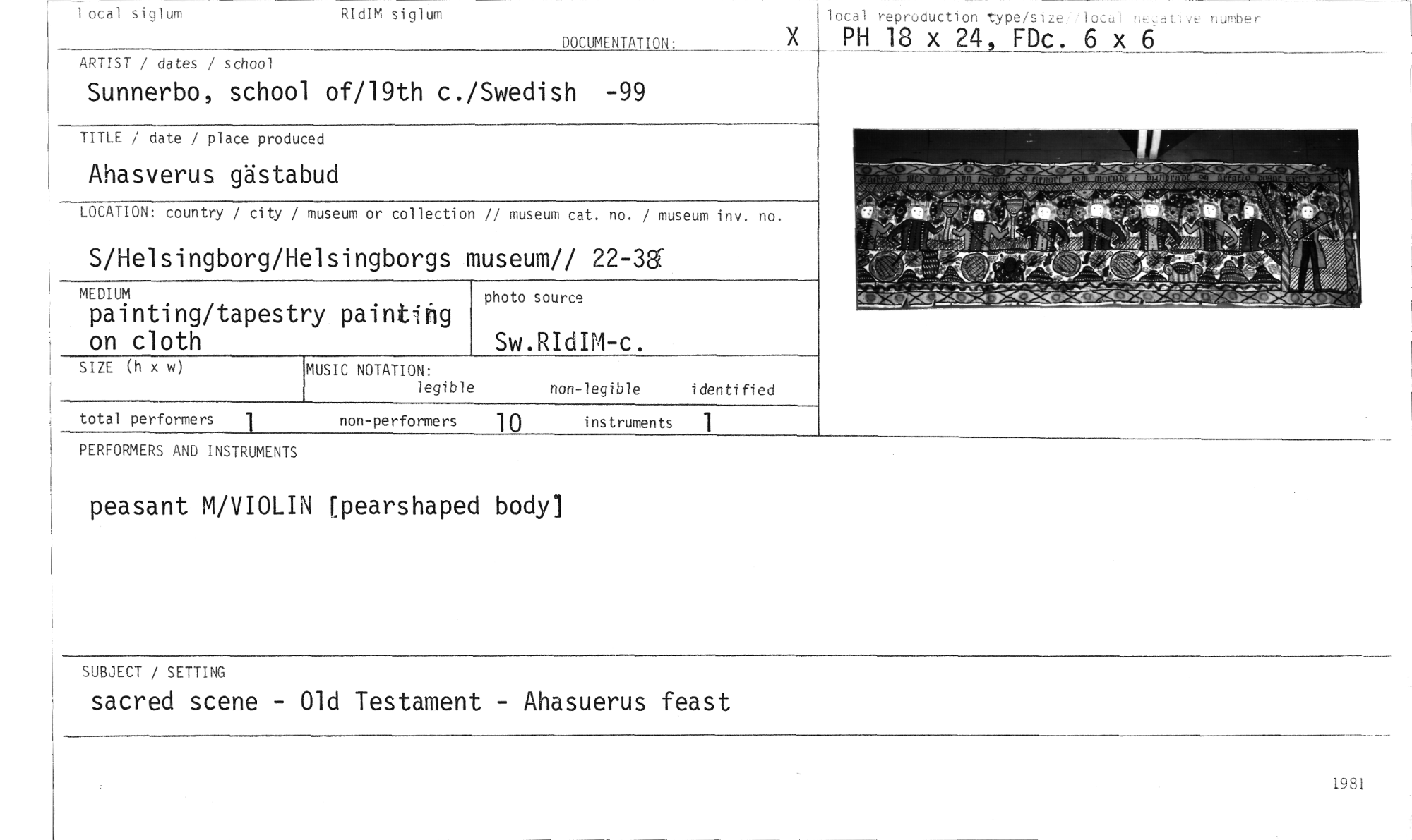 //// ry painting //// S/Helsingborg/H //// MEDIUM //// painting/tapest //// on cloth //// SIZE (h x w) //// 1 //// total performers 1 //// non-performers 1 0 instruments //// R dIM siglum //// DOCUMENTATION: //// lotal reproduction type/size..ilocal rezat.ve number //// PH 18 x 24, FDc. 6 x 6 //// 1 ocal siglum //// ARTIST / dates / school //// Sunnerbo, school of/19th c./Swedish -99 //// TITLE / date / place produced //// Ahasverus gästabud //// LOCATION: country / city / //// photo source //// Sw.RIdIM-c. //// non-legible identified //// museum or collection // museum cat. no. / museum inv. no. //// elsingborgs museum// 22-3Ef //// MUSIC NOTATION: //// legible //// PERFORMERS AND INSTRUMENTS //// peasant M/VIOLIN [pearshaped body] //// SUBJECT / SETTING //// sacred scene - Old Testament - Ahasuerus feast //// 191: //// LA / //// • //// !,„ ////