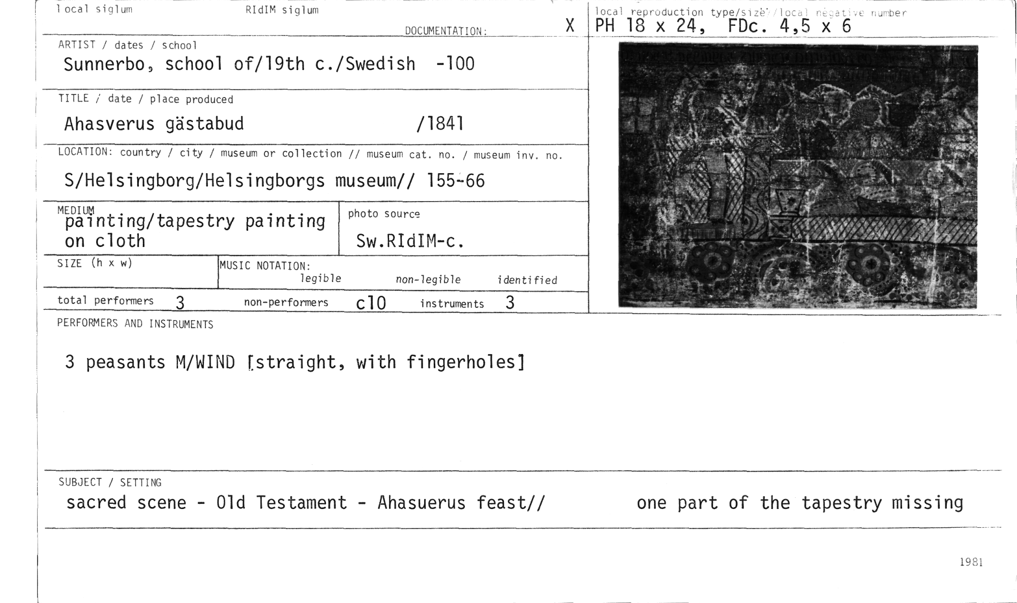 //// PERFORMERS AND INSTRUMENTS //// 3 peasants M/WIND [straight, with fingerholes] //// SUBJECT / SETTING one part of the tapestry missing //// sacred scene - Old Testament - Ahasuerus feast// //// //// //// r lotal siglum RIdIM siglum //// DOCUMENTATION: //// ARTIST / dates / school //// Sunnerbo, school of/19th c./Swedish -100 //// lotal reproduction type/size rJrber //// X PH 18 x 24, FDc. 4,5 x //// TITLE / date / place produced //// Ahasverus gästabud /1841 //// LOCATION: country / city / museum or collection // museum cat. no. / museum inv. no. //// S/Helsingborg/Helsingborgs museum// 155-66 //// photo source //// Sw.RIdIM-c. //// MUSIC NOTATION: //// legible //// total performers 3 non-performers //// non-legible identified //// C 1 0 instruments 3 ////