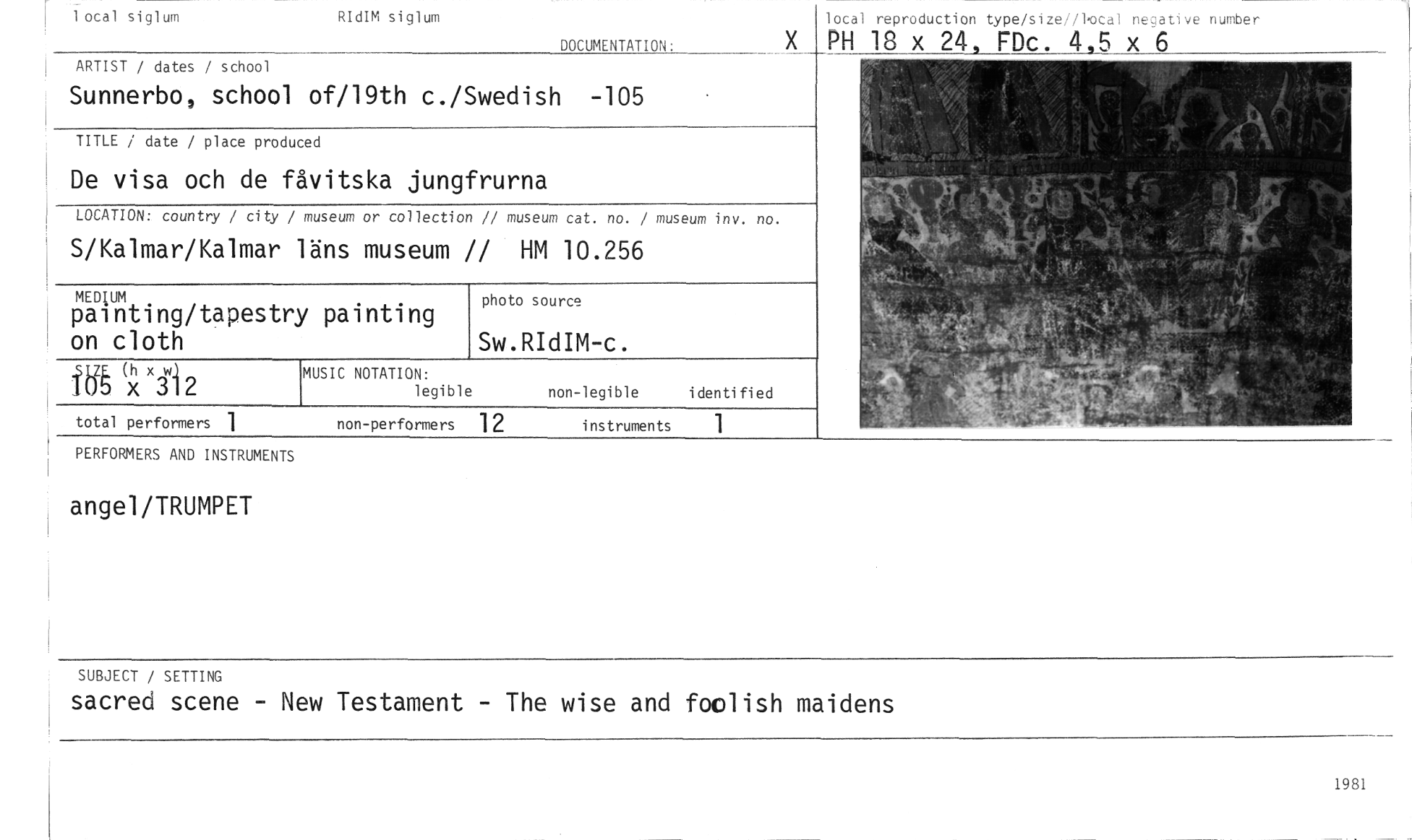 //// PERFORMERS AND INSTRUMENTS //// angel/TRUMPET //// SUBJECT / SETTING //// sacred scene - New Testament - The wire and foolish maidens //// 1981 //// RIdIM siglum //// rlocal siglum //// DOCUMENTATION. //// ARTIST / dates / school //// Sunnerbo, school of/19th c./Swedish -105 //// TITLE / date / place produced //// De visa och de fåvitska jungfrurna //// LOCATION: country / city / museum or collection // museum cat. no. / museum inv. no. //// S/Kalmar/Kalmar läns museum // HM 10.256 //// MEDIUM //// painting/tapestry painting on cloth //// in ()C xgl 2 //// total performers 1 //// MUSIC NOTATION: //// legible //// non-performers 12 instruments //// photo source //// Sw.RIdIM- //// local reproduction type/sizenlvcal negative number //// PH 18 x 24, FDc. 4,5 x 6 //// non-legible identified ////