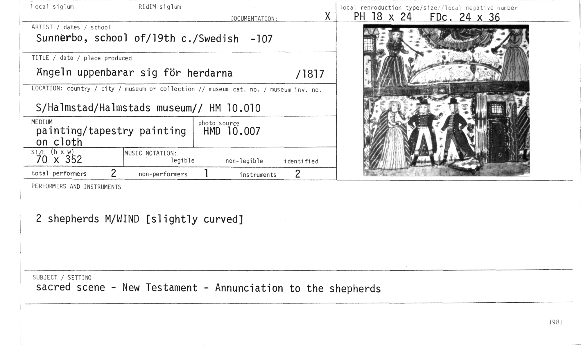 //// PERFORMERS AND INSTRUMENTS //// 2 shepherds M/WIND [slightly curved] //// SUBJECT / SETTING //// sacred scene - New Testament - Annunciation to the shepherds //// PH 18 x 24 FDc. 24 x 36 //// DOCUMENTATION. //// 1 ocal siglum //// RIdIM siglum //// local reproduction type/size//local negative number //// ARTIST / dates / school //// Sunnerbo, school of/19th c./Swedish -107 //// TITLE / date / place produced //// Ängeln uppenbarar sig för herdarna /1817 //// LOCATION: country / city / museum or collection // museum cat. no. / museum inv. no. //// S/Halmstad/Halmstads museum// HM 10.010 //// MEDIUM //// painting/tapestry painting on cloth //// photo sourco //// HMD 10.007 //// SIZE (h x w) //// 70 x 352 //// MUSIC NOTATION: //// legible //// non-legible identified //// instruments 2 //// 1981 ////