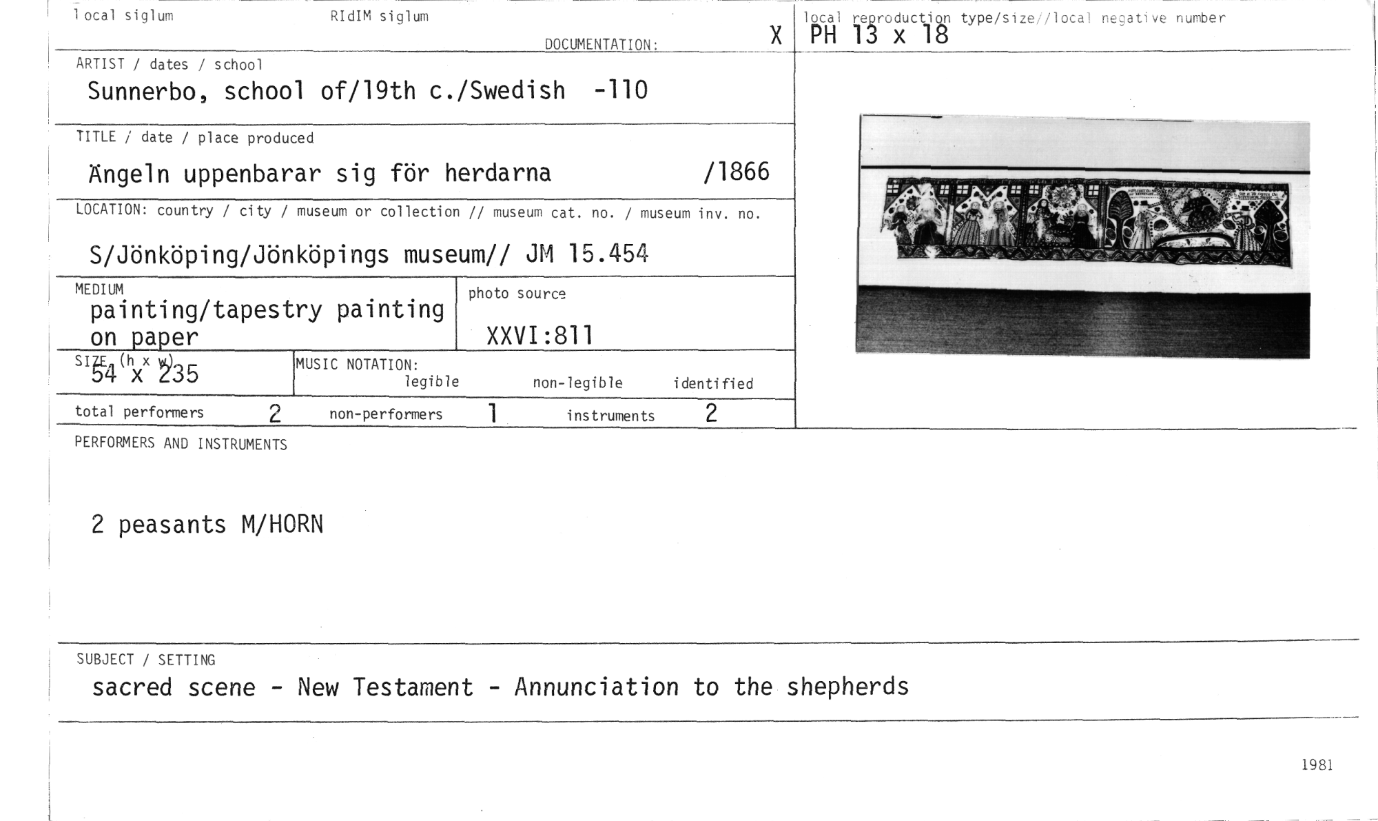 //// 2 peasants M/HORN //// SUBJECT / SETTING //// sacred scene - New Testament - Annunciation to the shepherds //// 1 ocal siglum //// RIdIM siglum //// DOCUMENTATION: //// x lhciail rieäroxductiiä type/sizel/local negative number //// ARTIST / dates / school //// Sunnerbo, school of/19th c./Swedish -110 //// TITLE / date / place produced //// Ängeln uppenbarar sig för herdarna /1866 //// LOCATION: country / city / museum or collection // museum cat. no. / museum inv. no. //// S/Jönköping/Jönköpings museum// JM 15.454 //// MEDIUM //// painting/tapestry painting on paper //// photo source //// 9E4 chxx )35 //// MUSIC NOTATION: //// legible non-legible i denti fi ed //// instruments 2 //// PERFORMERS AND INSTRUMENTS //// XXVI:811 //// 1981 ////
