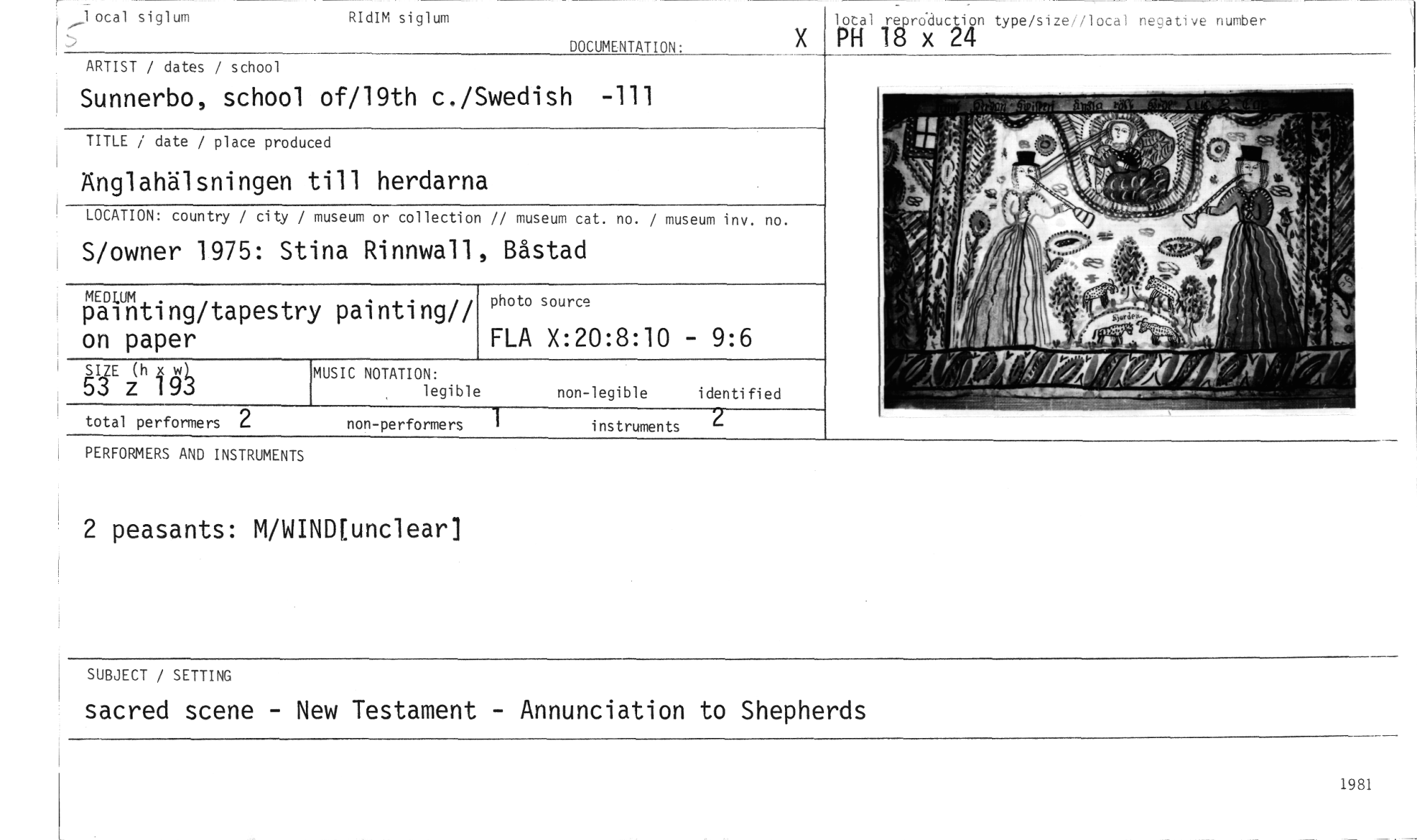 //// luta] re roduction type/size local ne..;atve number //// PH 18 x 24 //// J ocal siglum RIdIM siglum //// DOCUMENTATION: //// ARTIST / dates / school //// Sunnerbo, school of/19th c./Swedish -111 //// TITLE / date / place produced //// Änglahälsningen till herdarna //// LOCATION: country / city / museum or collection // museum cat. no. / museum inv. no. //// S/owner 1975: Stina Rinnwall, Båstad //// MEDWM //// painting/tapestry painting// on paper //// MUSIC NOTATION: //// legible non-legible identified //// total performers 2 non-performers 1 instruments //// photo source //// FLA X:20:8:10 - 9:6 //// PERFORMERS AND INSTRUMENTS //// 2 peasants: M/WIND[unclear] //// SUBJECT / SETTING //// sacred scene - New Testament - Annunciation to Shepherds //// 1981 ////