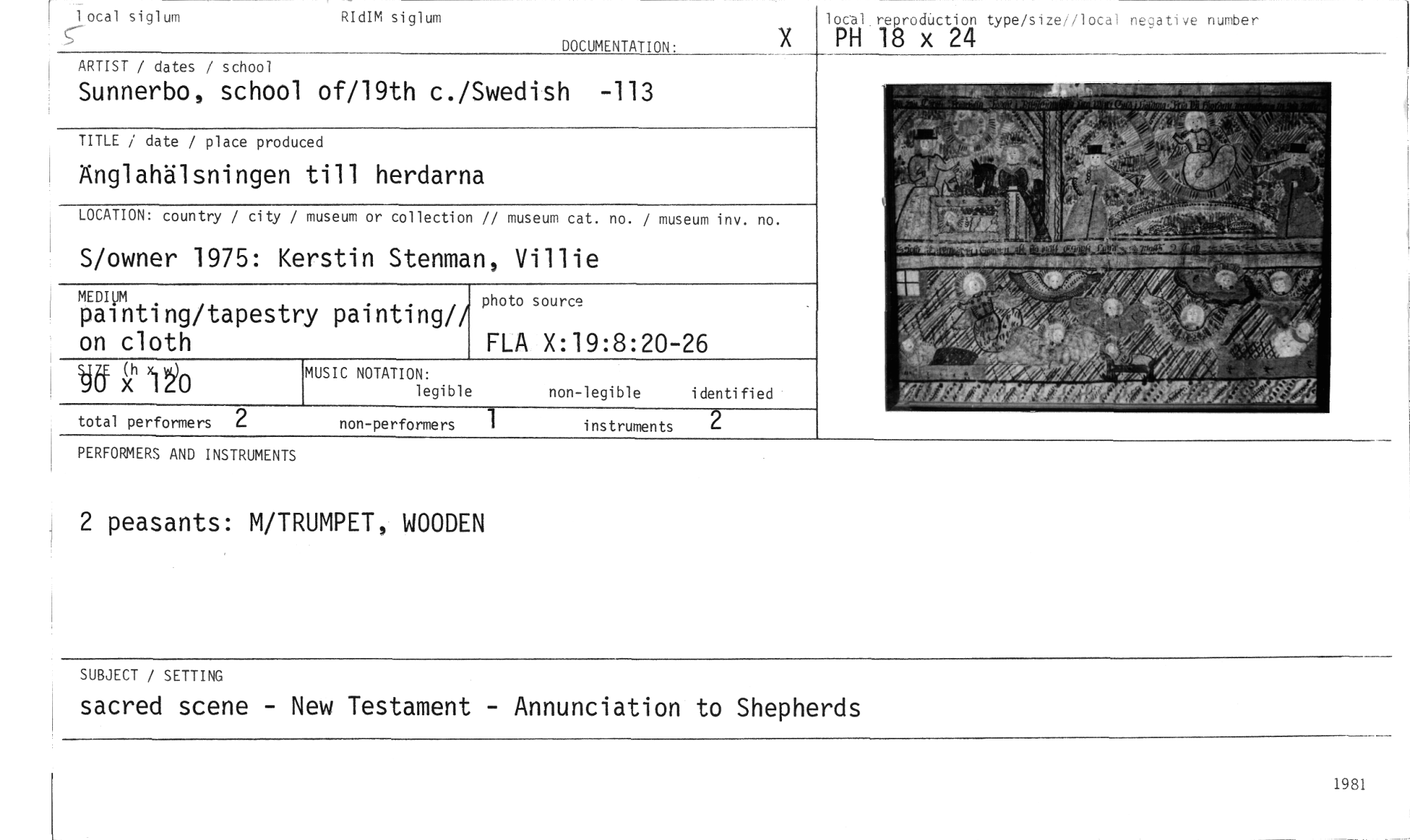 //// lotal siglum RIdIM siglum //// DOCUMENTATION: //// ARTIST / dates / school //// Sunnerbo, school of/19th c./Swedish -113 //// TITLE / date / place produced //// Änglahälsningen till herdarna //// LOCATION: country / city / museum or collection // museum cat. no. / museum inv. no. //// S/owner 1975: Kerstin Stenman, Villie //// MEDIUM //// painting/tapestry painting// on cloth //// local reproduction type/size noter //// PH 18 x 24 //// photo source //// FLA X:19:8:20-26 //// MUSIC NOTATION: //// legible non-legible identified //// total performers 2 non-performers 1 instruments 2 //// PERFORMERS AND INSTRUMENTS //// 2 peasants: M/TRUMPET, WOODEN //// SUBJECT / SETTING //// sacred scene - New Testament - Annunciation to Shepherds //// 1981 ////