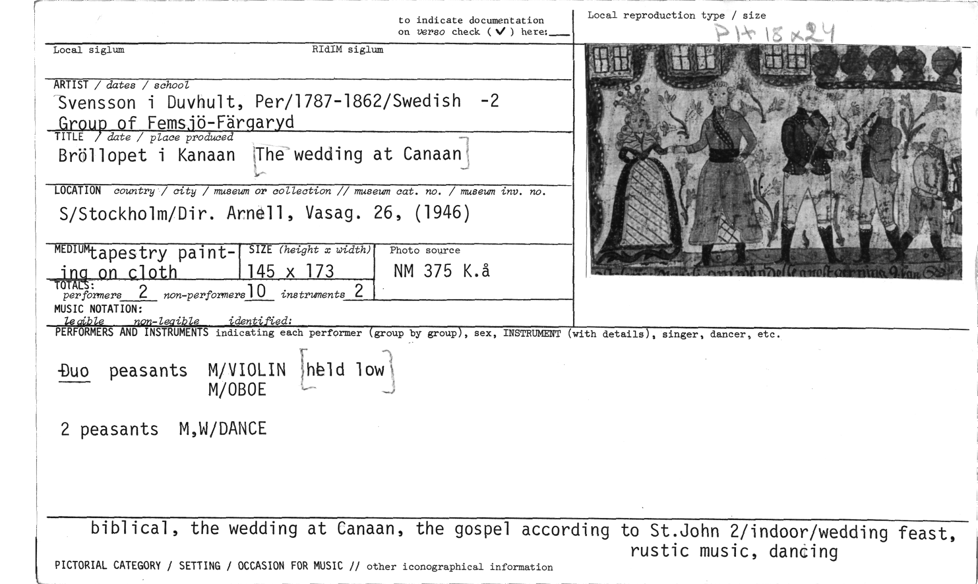 //// Local reproduction type / size //// to indicate documentation on verso check ( ) //// Local siglum RIdIM siglum //// ARTIST / dates / school //// Svensson i Duvhult, Per/1787-1862/Swedish -2 Carns.ö-Färaryd //// TITLE date / place produced //// Bröllopet i Kanaan ;The wedding at Canaan //// LOCATION country / city / museum or collection // museum cat. no. / museum inv. no. //// S/Stockholm/Dir. Arnell, Vasag. 26, (1946) //// MUSIC NOTATION: //// lecible non-lecible identified: //// PERFORMERS AND INSTRUMENTS indicating each performer (group by //// -Duo peasants M/VIOLIN Mbld low //// M/OBOE //// 2 peasants M,W/DANCE //// 4TÅtq: //// per formers 2 non-perforners] 0 instruments 2 //// ""apestry painton. clbth //// SIZE (hetght x xtdth) //// 145 x 173 //// Photo source //// NM 375 K.å //// group), sex, INSTRUMENT (with details), singer, dancer, etc. //// biblical, the wedding at Canaan, the gospel according to St.John 2/indoor/wedding feast, //// rustio music, dancing //// PICTORIAL CATEGORY / SETTING / OCCASION FOR MUSIC /1 other iconographical information ////