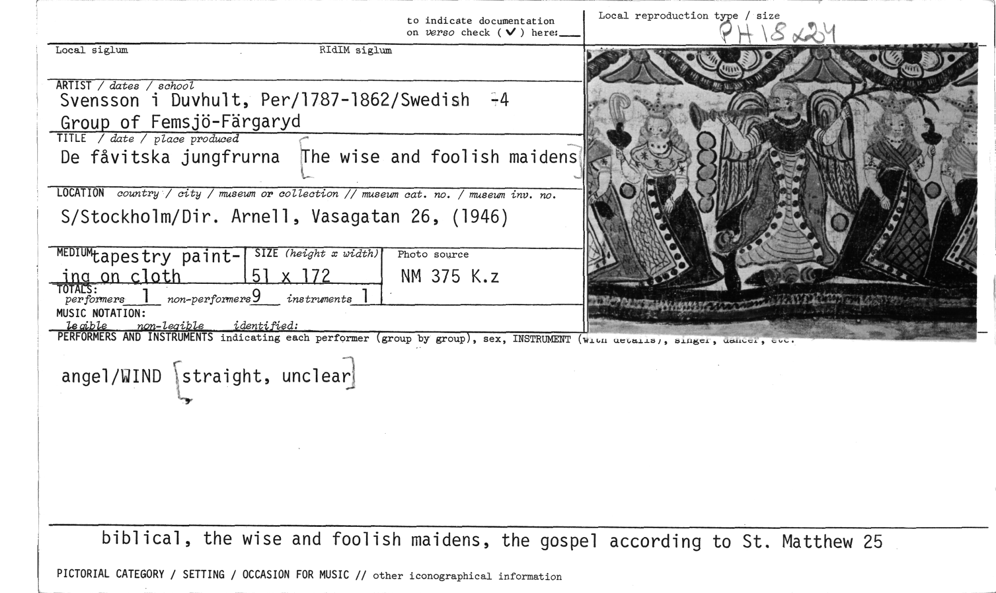 //// Photo source //// NM 375 K.z //// SIZE (height x width) //// MEMUK.-- //// -4pes try paint- //// angel/WIND straight, unclear //// -"Y //// biblical, the wise and foolish maidens, the gospel according to St. Matthew 25 //// PICTORIAL CATEGORY / SETTING / OCCASION FOR MUSIC // other iconographical information //// to indicate documentation //// on verso check (V) here:_ //// Local siglum RidIM siglum //// LOCATION country / city / museum or collection // museum cat. no. / museum inv. no. //// S/Stockholm/Dir. Arnell, Vasagatan 26, (1946) //// Local reproduction type / size //// dag //// bAJSC.L., //// ARTIST / dates / school //// Svensson i Duvhult, Per/1787-1862/Swedish Group of Femsjö-Färgaryd //// TITLE / date / place produce //// De fåvitska jungfrurna The wise and foolish maidens //// Tma on cloth 51 x 172 //// per formers 1 non-performers9 instruments 1 //// MUSIC NOTATION: //// le4bLe non-lestible identified: //// PERFORMERS AND INSTRUMENTS indicating each performer (group by group), sex, INSTRUMENT ////