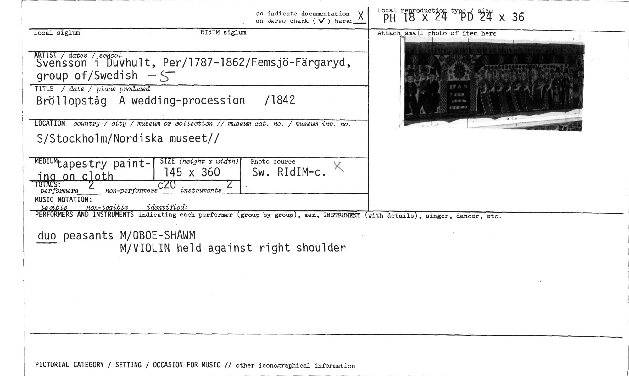 //// to indicate documentation //// on verso check (N/ ) here:___ //// Local siglum RIdIM siglum //// ARTIST / dates / school //// Svensson i Duvhult, Per/1787-1862/Femsjö-Färgaryd, group of/Swedish //// TITLE / date / place produced //// Bröllopståg A wedding-procession /1842 //// LOCATION country./ city / museum or collection // museum cat. no. / museum inv. no. //// S/Stockholm/Nordiska museet// //// Loisaå TgiodkIctål typs„( s2r x 36 Attach small photo of item here //// SIZE (height r width) //// 145 x 360 //// Photo source //// Sw. RIdIM-c. 51" //// per formers non-performersC instruments //// MUSIC NOTATION: //// 4tible //// PERFORMERS AND INSTRUMENTS indicating each performer (group //// by group), sex, INSTRUMENT (with details), singer, dancer, etc. //// duo peasants M/OBOE-SHAWM //// M/VIOLIN held against right shoulder //// PICTORIAL CATEGORY / SETTING / OCCASION FOR MUSIC // other iconographical information ////