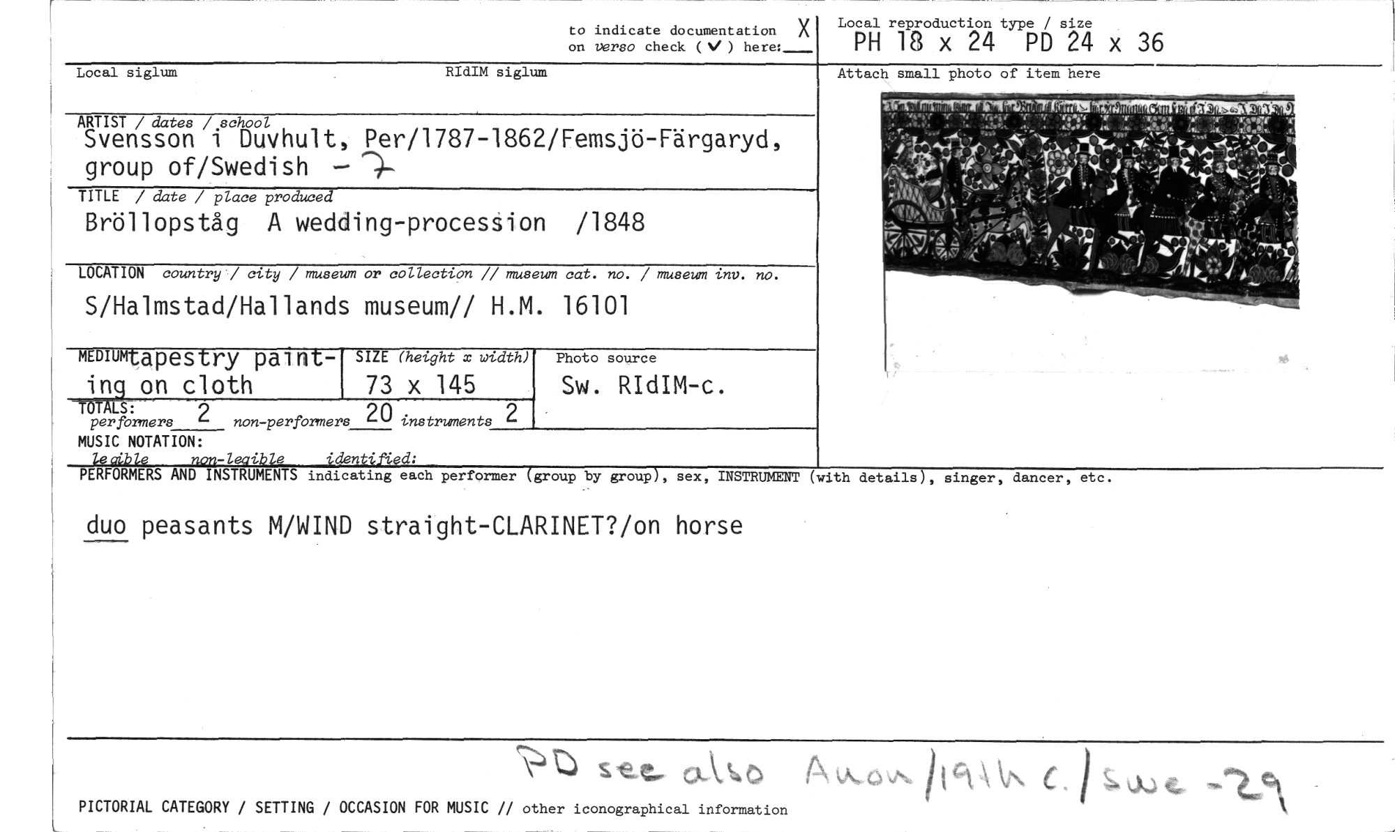 //// to indicate documentation X //// on verso check (V) here:_ //// Local reproduction type / size //// PH 18 x 24 PD 24 x 36 //// Local siglum RIdIM siglum //// ARTIST / dates / school //// Svensson i Duvhult, Per/1787-1862/Femsjö-Färgaryd, group of/Swedish — //// TITLE / date / place produced //// Bröllopståg A wedding-procesåion /1848 //// LOCATION country / city / museum or collection // museum cat. no. / museum inv. no. //// S/Halmstad/Hallands museum// H.M. 16101 //// rommt apestry painting on cloth //// -TOTALS: 2 //// per formers non-performers //// SIZE (height x width) //// 73 x 145 //// 20 instruments 2 //// Photo source //// Sw. RIdIM-c. //// Attach small photo of item here //// MUSIC NOTATION: //// lecible non-leoible identified: //// PERFORMERS AND INSTRUMENTS indicating each performer (group by group), sex, INSTRUMENT //// duo peasants M/WIND straight-CLARINET?/on horse //// (with details), singer, dancer, etc. //// \'D segtx\,54,0 A V. et 1..N. CA C. //// PICTORIAL CATEGORY / SETTING / OCCASION FOR MUSIC // other iconographical information ////