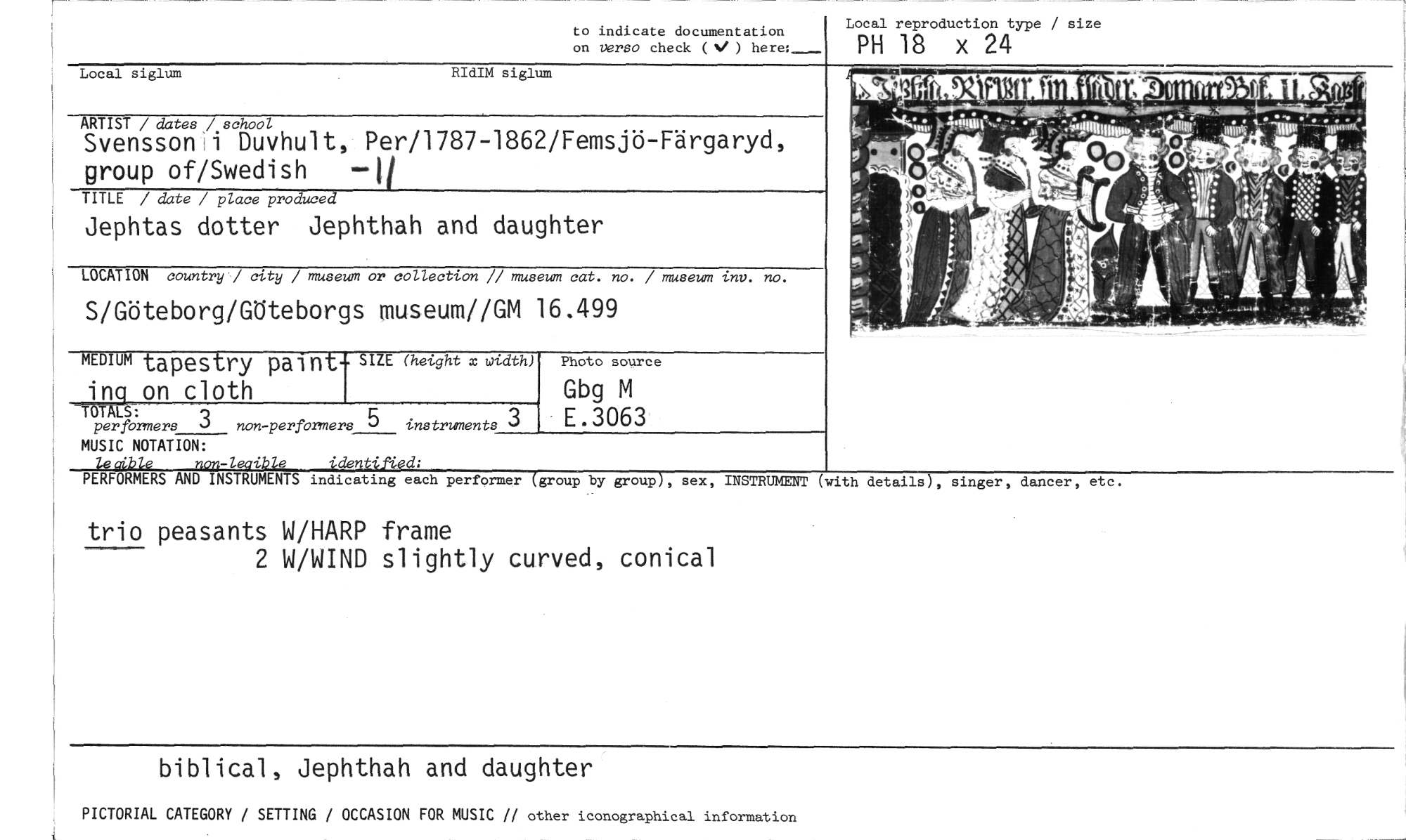 //// Local reproduction type / size //// to indicate documentation on verso check ( ) //// Local siglum RIdIM siglum //// ARTIST / dates /.school //// Svenssoni Duvhult, Per/1787-1862/Femsjö-Färgaryd, group of/Swedish --1/ //// TITLE / date / place produced //// Jephtas dotter Jephthah and daughter //// LOCATION country / city / museum or collection // museum cat. no. / museum inv. no. //// S/Göteborg/GÖteborgs museum//GM 16.499 //// PH 18 x 24 //// l!,999,!!!!3.1111,,,J2'11.2 //// MEDIUM tapestry paint- SIZE (height x width) //// Ti0P125 on cloth //// perförmers 3 non-performers 5 instruments 3 MUSIC NOTATION: //// non-leaible identified; //// PERFORMERS AND INSTRUMENTS //// Photo source //// Gbg M E.3063 //// INSTRUMENT (with details), singer, dancer, etc. //// indicating each performer (group by group), sex, //// trio peasants W/HARP frame //// 2 W/WIND slightly curved, conical //// biblical, Jephthah and daughter //// PICTORIAL CATEGORY / SETTING / OCCASION FOR MUSIC // other iconographical information ////