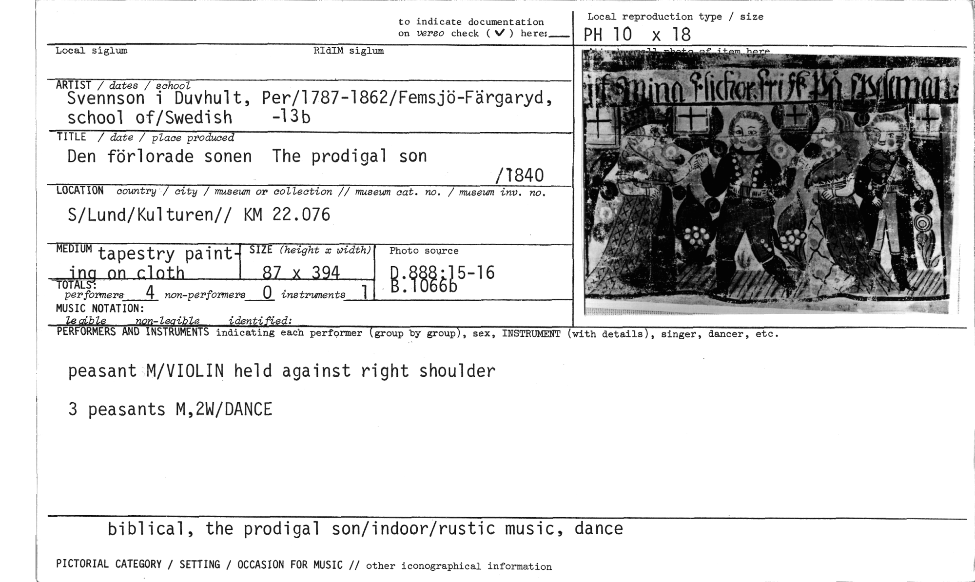 //// to indicate documentation //// on verso check (V ) here:_ //// PH 10 x 18 //// Local reproduction type / size //// Local siglum RIdIM siglum //// ARTIST / dates / school //// Svennson i Duvhult, Per/1787-1862/Femsjö-Färgaryd, school of/Swedish -13b //// TITLE / date / place produced //// Den förlorade sonen The prodigal son //// /1840 //// LOCATION country / city / museum or collection // museum cat. no. / museum inv. no. //// S/Lund/Kulturen// KM 22.076 //// Photo source //// MUSIC NOTATION: //// letible non-leaible identified: //// PERFORMERS AND INSTRUMENTS indicating each performer (group by group), sex, INSTRUMENT (with //// peasant M/VIOLIN held against right shoulder 3 peasants M,2W/DANCE //// on cloth //// TÅN //// MEDIUM tapestry paint- SIZE (height x width) //// 27 x 394 //// perfbrmers 4 non-performers 0 instruments 1 //// BiBfig5-16 //// details), singer, dancer, etc. //// biblical, the prodigal son/indoor/rustic music, dance //// PICTORIAL CATEGORY / SETTING / OCCASION FOR MUSIC // other iconographical information ////