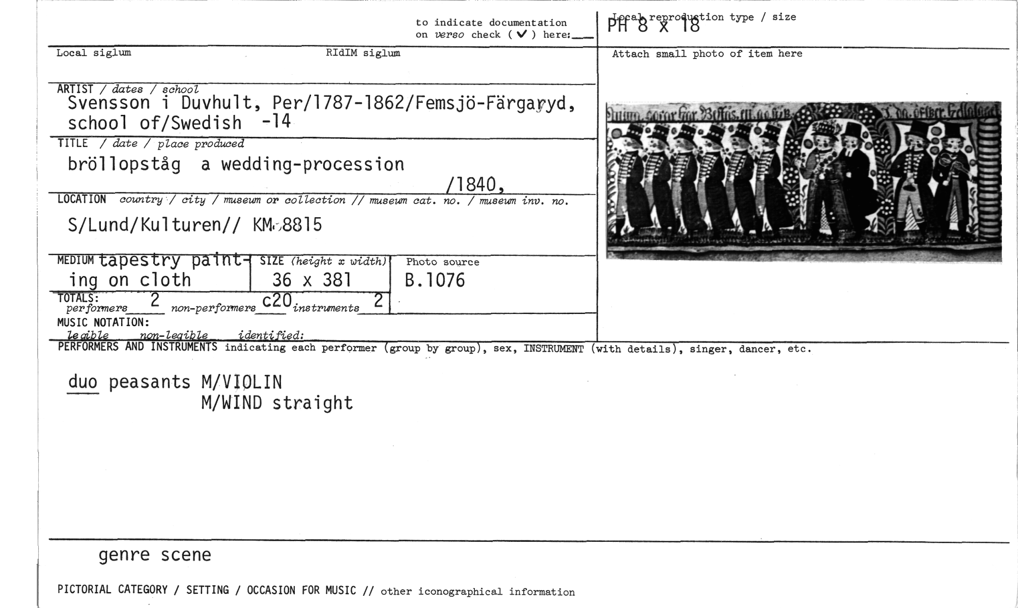 //// duo peasants M/VIOLIN //// M/WIND straight //// genre scene //// PICTORIAL CATEGORY / SETTING / OCCASION FOR MUSIC // other iconographical information //// to indicate documentation on verso check (V ) here: //// Offabrekrolmätion type / size //// by group), sex, //// indicating each performer (group //// INSTRUMENT (with details), singer, dancer, etc. //// Local siglum RIdIM siglum //// ARTIST / dates / school //// Svensson i Duvhult, Per/1787-1862/Femsjö-Färgaryd, school of/Swedish -14 //// TITLE / date / place produced //// bröllopståg a wedding-procession //// /1840, //// LOCATION country / city / museum or collection // museum cat. no. / museum inv. no. //// Attach small photo of item here //// S/Lund/Kulturen// KW8815 //// MEDIUM tapestry paint- SIZE (height x width) //// ing on cloth 36 x 381 //// -MWS: 2 //// per formers non-performers C20instruments 2 //// MUSIC NOTATION: //// le alble non-legible idäntified: //// PERFORMERS AND INSTRUMENTS //// Photo source //// B.1076 ////