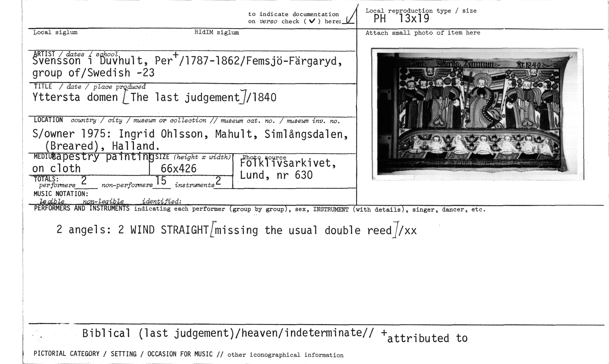 //// to indicate documentation //// on versa check (4.1 ) here: //// Local reproduction type / size //// PH 13x19 //// Ar.tuMf!,1 //// X-Ur-7 -/111 2,17;: //// '01PL4 //// 4•^^ //// OK //// ll //// Local siglum RIdIM siglum //// gT/g‘ötris'i ftj //// Per+11787-1862/Femsjö-Färgaryd, //// group of/Swedish -23 //// TITLE / date / place prgduced //// Yttersta domen LThe last judgement7/1840 //// LOCATION country / city / museum or collection // museum cat. no. / museum inv. no. //// S/owner 1975: Ingrid Ohlsson, Mahult, Simlångsdalen, (Breared), Halland. //// MEDItapestry paintin gsizE (height x width) //// ältkriaarkivet, //// on cloth 66x426 //// Lund, nr 630 //// TOTALS: 2 //// per formers non-perfbrmers 15 instruments 2 //// MUSIC NOTATION: //// leable non-lepible identilUd: //// PERFORMERS AND INSTRUMENTS indicating each performer (group by group), sex, //// Attach small photo of item here //// INSTRUMENT (with details), singer, dancer, etc. //// 2 angels: 2 WIND STRAIGHT[missing the usual double reedj/xx //// Biblical (last judgement)/heaven/indeterminate// attributed to //// PICTORIAL CATEGORY / SETTING / OCCASION FOR MUSIC // other iconographical information ////