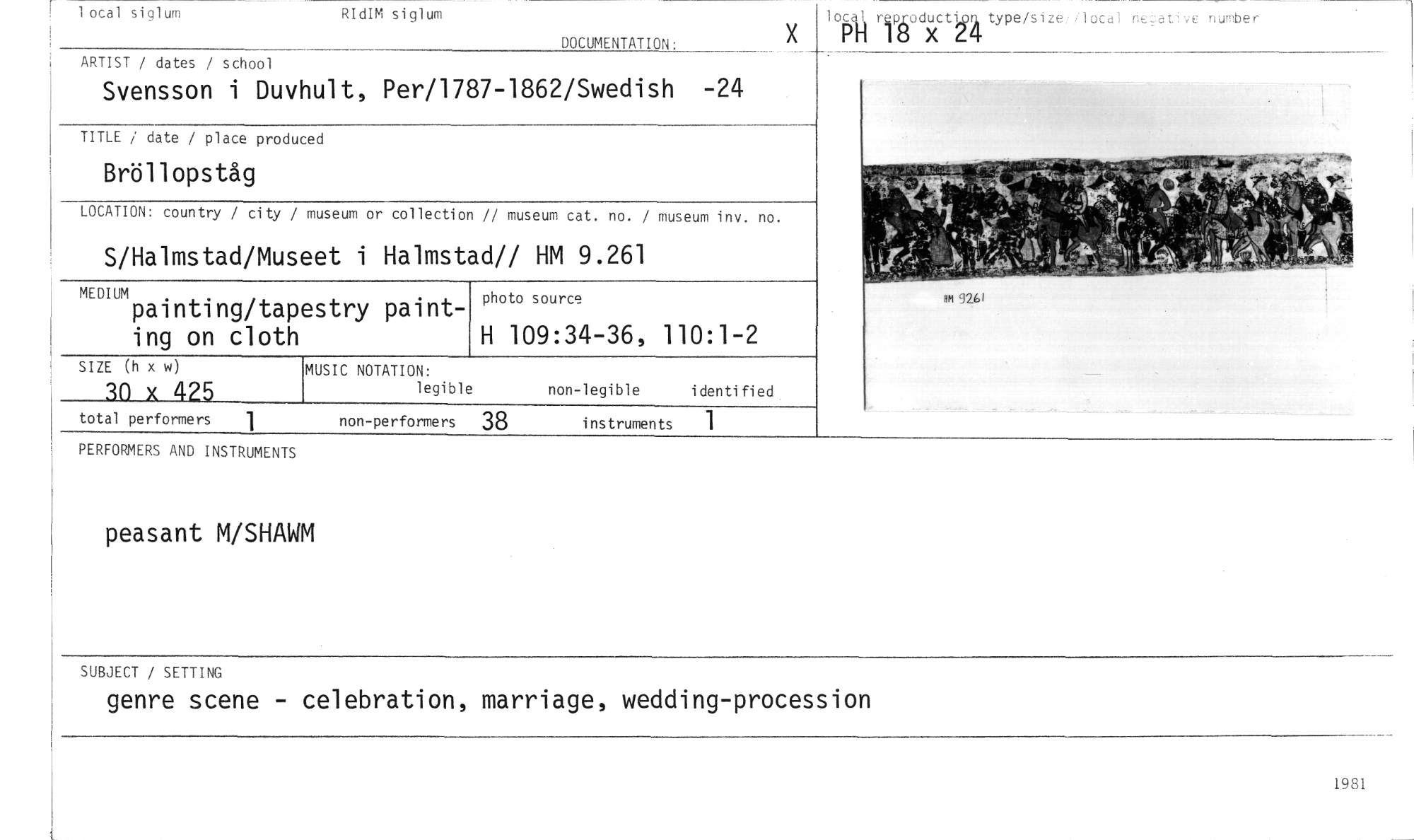 //// x //// 1 otal siglum RIdIM siglum //// DOCUMENTATION: //// ARTIST / dates / school //// Svensson i Duvhult, Per/1787-1862/Swedish -24 //// TITLE / date / place produced //// Bröllopståg //// LOCATION: country / city / museum or collection // museum cat. no. / museum inv. no. //// S/Halmstad/Mus eet i Halmstad// HM 9.261 //// MEDIUM painting/tap estry painting on cloth //// SIZE (h x w) //// non-legible identified //// 30 x 425 //// MUSIC NOTATION: //// legible //// photo source //// H 109:34-36, 110:1-2 //// loc41 reproductIP //// PH 18 x //// type/size, local ne //// at 've number //// total performers 1 non-performers 38 instruments 1 //// PERFORMERS AND INSTRUMENTS //// peasant M/SHAWM //// SUBJECT / SETTING //// genre scene - celebration, marriage, wedding-procession //// 1981 ////
