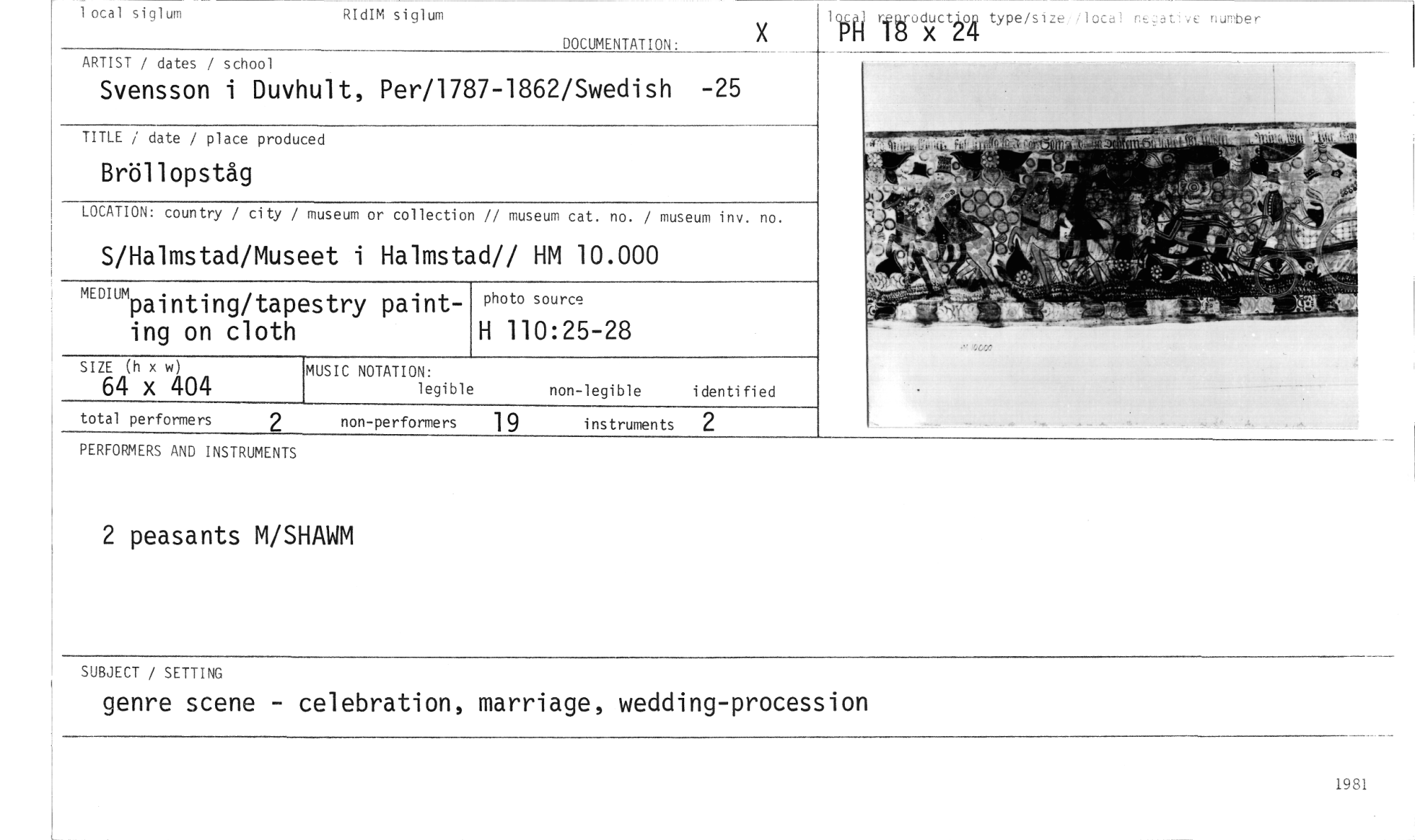 //// 2 peasants M/SHAWM //// SUBJECT / SETTING //// genre scene - celebration, marriage, wedding-procession //// x //// DOCUMENTATION: //// otal siglum RIdIM siglum //// ductAok type/size /local r, rlve //// i ö X LLF noter //// ARTIST / dates / school //// Svensson i Duvhult, Per/1787-1862/Swedish -25 //// TITLE / date / place produced //// Bröllopståg //// LOCATION: country / city / museum or collection // museum cat. no. / museum inv. no. //// S/Halmstad/Museet i Halmstad// HM 10.000 //// "mpai nting/tapestry painting on cloth //// SIZE (h x w) //// 64 x 404 //// photo source //// H 110:25-28 //// non-legible i den ti fi ed //// MUSIC NOTATION: //// legible //// total performers 2 //// PERFORMERS AND INSTRUMENTS //// non-performers 19 instruments 2 //// 1981 ////