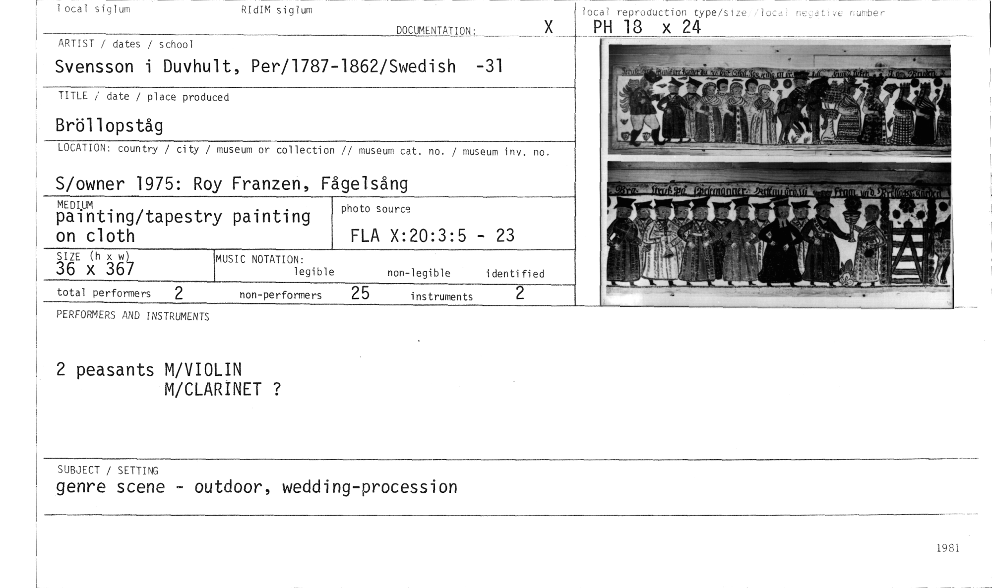 //// 1 ocal siglum //// RIdIM siglum //// DOCUMENTATION: //// lotal reproduction type/size.ilocal ne,Jative number //// X PH 18 x 24 //// ARTIST / dates / school //// Svensson i Duvhult, Per/1787-1862/Swedish -31 //// TITLE / date / place produced //// Bröllopståg //// LOCATION: country / city / museum or collection // museum cat. no. / museum inv. no. //// ri n 14M15 //// S/owner 1975: Roy Franzen, Fågelsång //// MEDIUM //// painting/tapestry painting on cloth //// photo source //// FLA X:20:3:5 - 23 //// SIZE (h x w //// 36 x 367 //// MUSIC NOTATION: //// legible non-legible identified //// total performers 2 non-performers 25 //// 2 //// instruments //// PERFORMERS AND INSTRUMENTS //// 2 peasants M/VIOLIN //// M/CLARINET ? //// SUBJECT / SETTING //// genre scene - outdoor, wedding-procession //// 1981 ////