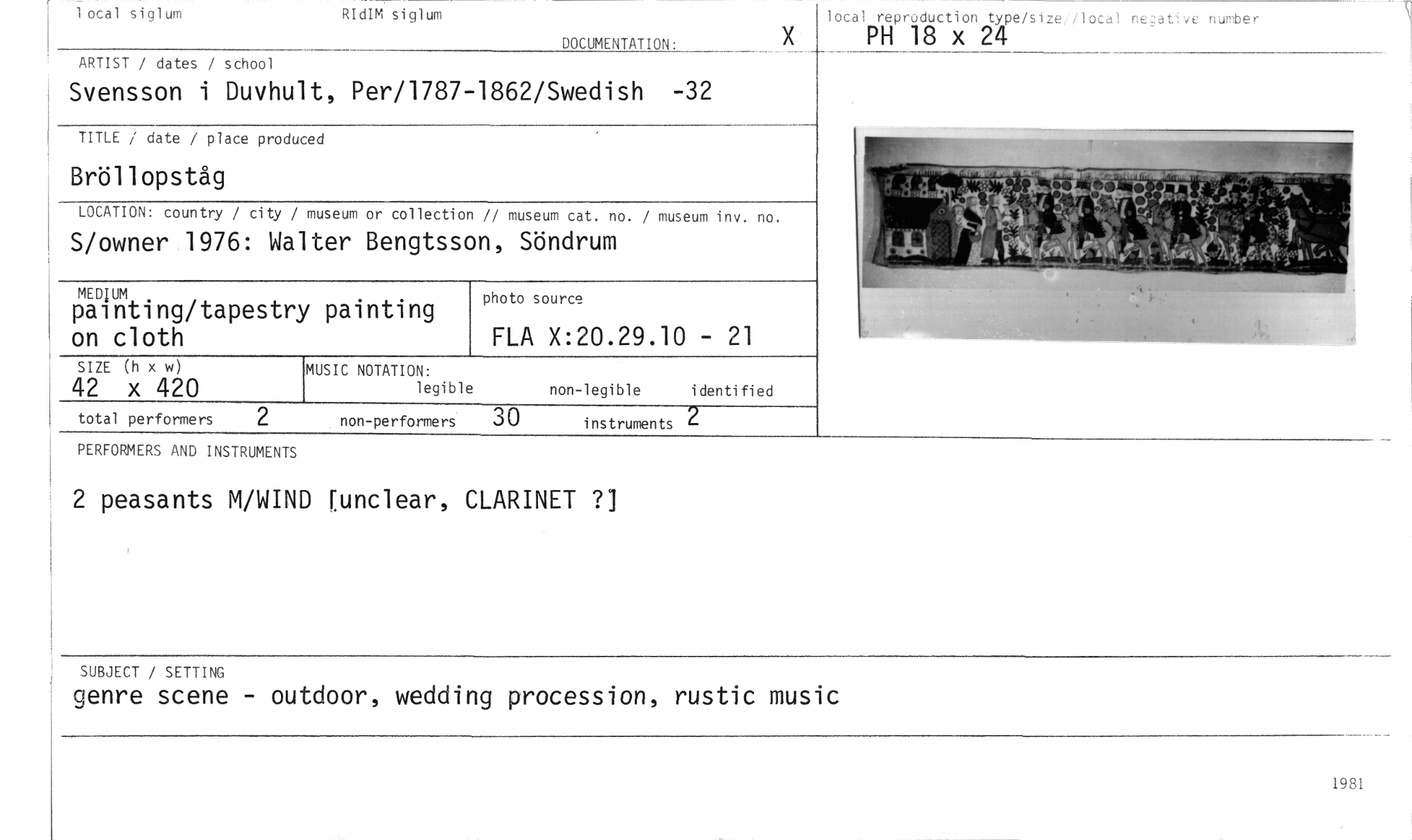 //// 1 ocal siglum RIdIM siglum //// DOCUMENTATION: //// lotal repreduction type/s ze 1ocal negative number //// PH 18 x 24 //// ARTIST / dates / school //// Svensson i Duvhult, Per/1787-1862/Swedish -32 //// TITLE / date / place produced //// Bröllopståg //// LOCATION: country / city / museum or collection // museum cat. no. / museum inv. no. //// S/owner 1976: Walter Bengtsson, Söndrum //// MEDIUM //// painting/tapestry painting on cloth //// photo source //// FLA X:20.29.10 - 21 //// MUSIC NOTATION: //// legible non-legible i denti fi ed //// SIZE (h x w) //// 42 x 420 //// instruments 2 //// total performers 2 non-performers //// PERFORMERS AND INSTRUMENTS //// 2 peasants M/WIND (unclear, CLARINET 7] //// SUBJECT / SETTING //// genre scene - outdoor, wedding procession, rustic music //// 1981 ////