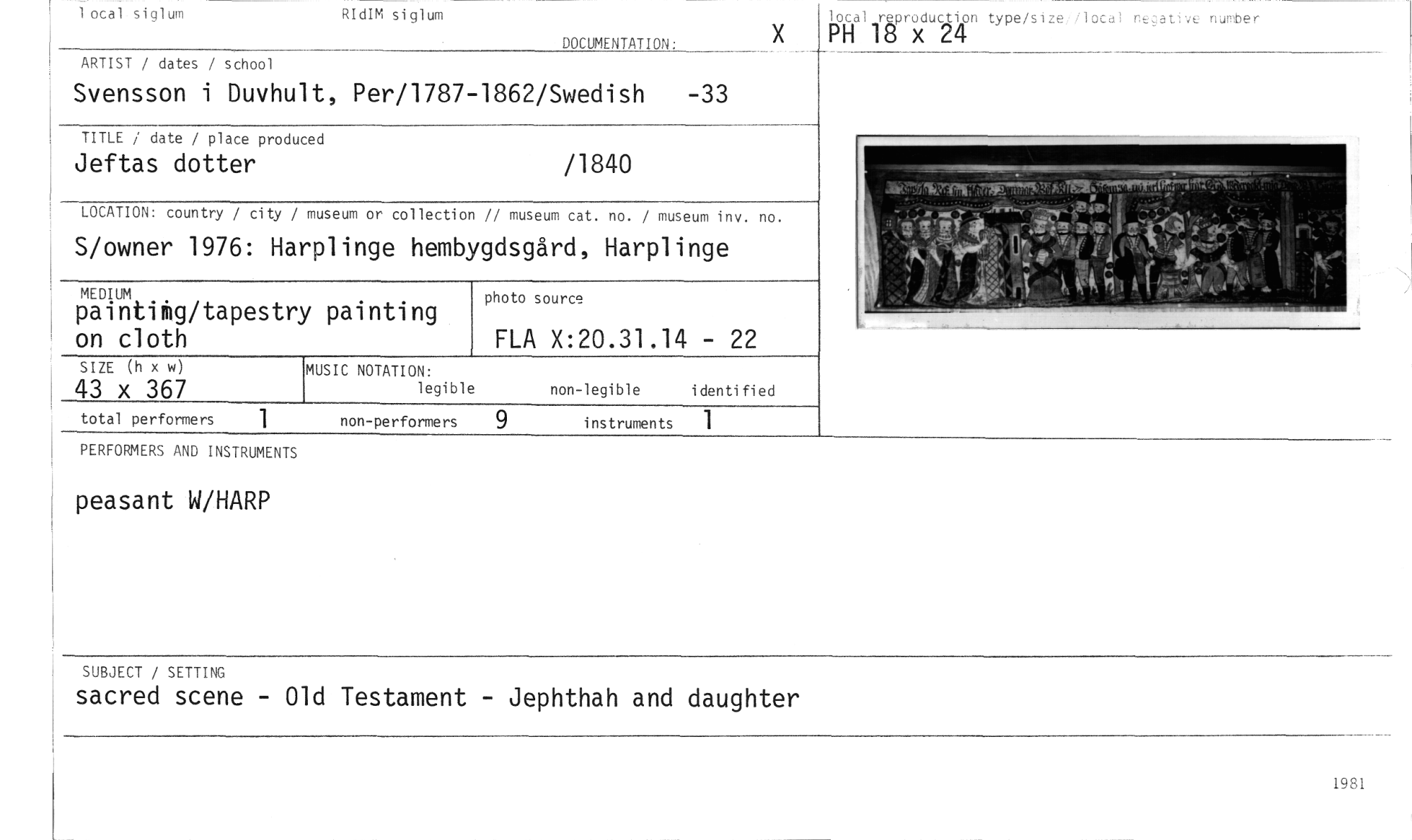 //// 1 ocal siglum RIdIM siglum //// DOCUMENTATION: //// lotal reproduclion type/sizei local negative number //// PH 18 x 24 //// ARTIST / dates / school //// Svensson i Duvhult, Per/1787-1862/Swedish -33 //// TITLE / date / place produced //// Jeftas dotter /1840 //// LOCATION: country / city / museum or collection // museum cat. no. / museum inv. no. //// S/owner 1976: Ha rplinge hembygdsgård, Harplinge //// MEDIUM //// paintikg/tapestry painting on cloth //// photo source //// FLA X:20.31.14 - 22 //// SIZE (h x w) //// 43 x 367 //// MUSIC NOTATION: //// legible //// non-legible identified //// total performers 1 non-performers 9 instruments 1 //// PERFORMERS AND INSTRUMENTS //// peasant W/HARP //// SUBJECT / SETTING //// sacred scene - Old Testament - Jephthah and daughter //// 1981 ////