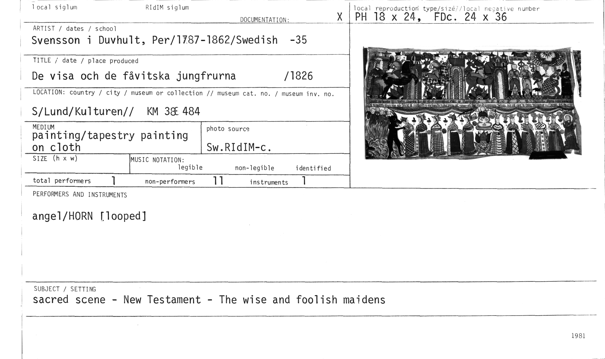 //// 1 ocal siglum RIdIM siglum DOCUMENTATION: lotal reproductiori type/sizr/loca neutive nurober //// X PH 18 x 24, FDc. 24 x 36 //// PERFORMERS AND INSTRUMENTS //// angel/HORN [looped] //// SUBJECT / SETTING //// sacred scene - New Testament - The wise and foolish maidens //// 1981 //// non-performers 11 instruments 1 //// total performers //// ARTIST / dates / school //// Svensson i Duvhult, Per/1787-1862/Swedish -35 //// TITLE / date / place produced //// De visa och de fåvitska jungfrurna /1826 //// LOCATION: country / city / museum or collection // museum cat. no. / museum inv. no. //// S/Lund/Kulturen// KM 38E484 //// MEDIUM //// painting/tapestry painting on cloth //// SIZE (h x w) //// MUSIC NOTATION: //// legible //// non-legible identified //// photo source //// Sw.RIdIM- ////