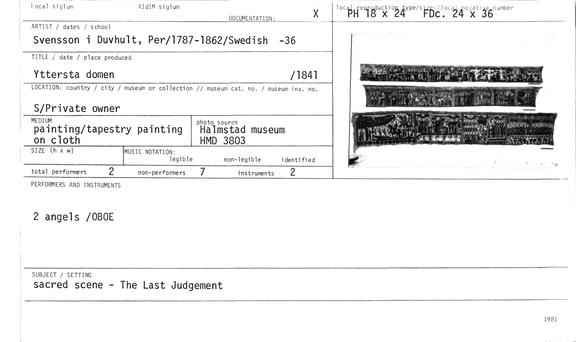 //// PERFORMERS AND INSTRUMENTS //// 2 angels /OBOE //// SUBJECT / SETTING //// sacred scene - The Last Judgement //// X 1 oci;gepi9,puctiX op ppe/s1,gt,j / 1 ocÅÅ 4 X ib xegatixe_number //// i DC • Z //// local siglum RIdIM siglum //// DOCUMENTATION: //// ARTIST / dates / school //// Svensson i Duvhult, Per/1787-1862/Swedish -36 //// TITLE / date / place produced //// Yttersta domen /1841 //// LOCATION: country / city / museum or collection // museum cat. no. / museum inv. no. //// S/Private owner //// MEDIUM //// painting/tapestry painting on cloth //// SIZE (h x w) //// non-legible identified //// total performers 2 non-performers 7 instruments 2 //// MUSIC NOTATION: //// legible //// photo source //// Halmstad museum HMD 3803 ////