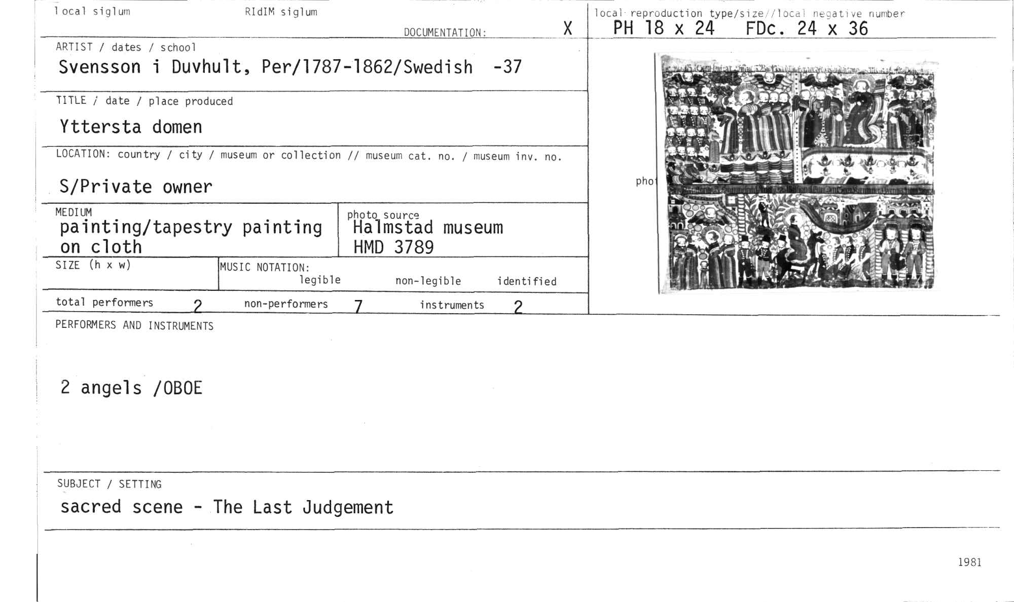 //// LOCATION: country / city / //// museum or collection // museum cat. no. / museum inv. no. //// 2 //// 7 //// instruments //// non-performers //// total performers //// local siglum RIdIM siglum //// DOCUMENTATION: //// ARTIST / dates / school //// Svensson i Duvhult, Per/1787-1862/Swedish -37 //// TITLE / date / place produced //// Yttersta domen //// S/Private owner //// MEDIUM //// painting/tapestry painting on cloth //// SIZE (h x w) //// non-legible identified //// MUSIC NOTATION: //// legible //// PH4Mead museum HMD 3789 //// pho //// PERFORMERS AND INSTRUMENTS //// 2 angels /OBOE //// SUBJECT / SETTING //// sacred scene - The Last Judgement //// local reproduction type/size//local negative number //// PH 18 x 24 FDc. 24 x 36 ////