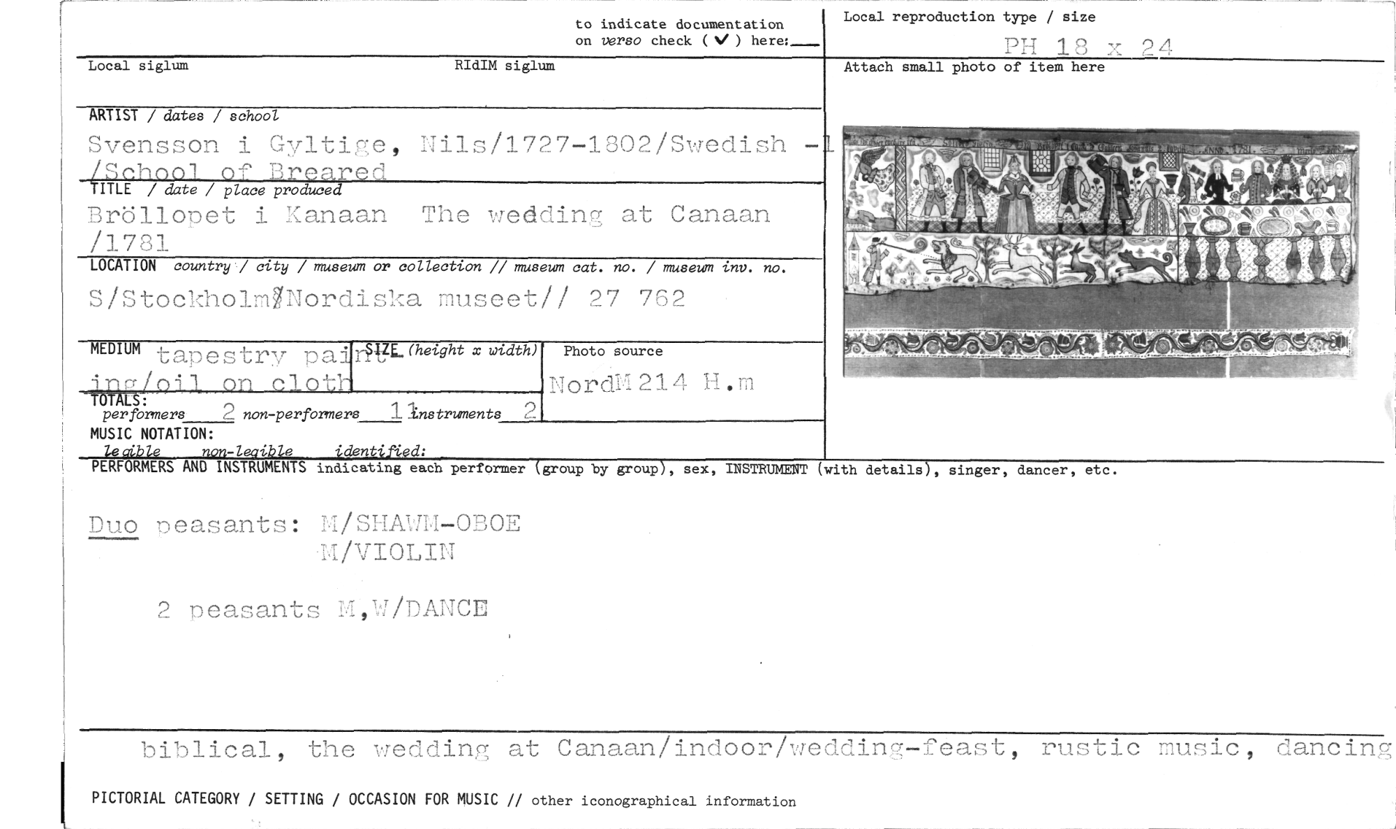 //// biblical, the wedding at Canaan/indoor/wedding-feast, rustic music, dancing //// PICTORIAL CATEGORY / SETTING / OCCASION FOR MUSIC // other iconographical information //// to indicate documentation //// on Derso check ( ) here:—.— //// Local reproduction type / size //// PH 13 x 24 //// Local siglum RIdIM siglum //// ARTIST / datea / school //// Attach small photo of item here //// Svensson i Gyltire, :111s/1727-1302/Swedish - //// • • //// ITLE / date / place produced //// Bröllopet i Xanaan The wedding at Canaan /1781 //// LOCATION country" city / museum or collection // museum cat. no. / museum int>. no. //// S/StockholmgNordiska museet// 27 762 //// MEDIUM tapestrv p a - (hetght x width.) //// %gå/211 on clot //// per formers 2 non-per formers 1 Instruments 2 //// MUSIC NOTATION: //// lecible non-lecible identified: //// PERFORMERS AND INSTRUMENTS indicating each performer (group by //// group), sex, INSTRUMENT (with details), ringer, dancer, etc. //// Photo source //// T1ord11214 1I.m //// Duo peasants: M/SHAWM-OBOE //// M/VIOLIN //// 2 peasants ,W/DANCE ////