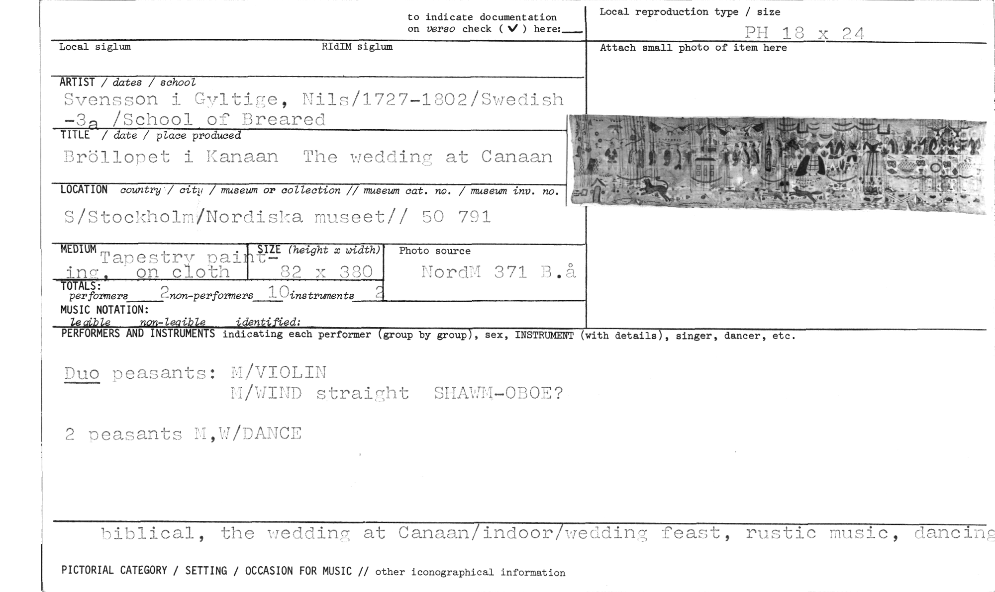 //// to indicate documentation Local reproduction type / size //// on verso check ( V ) hetes_ PH 18 x 24 //// Local siglum RIdIM siglum //// ARTIST / dates / school //// Svensson i G,,ltige, Nils/1727-1802/Swedish -3n /School of Breared //// TITLE / date / place produced //// Bröllopet i Kanaan The wedding at Canaan //// LOCATION country'/ citys / museum or collection // museum cat. no. / museum Inv. no. //// S/Stockholm/Nordiska museet!! 50 791 //// Attach small photo of item here //// MEDIUM //// 5IZE (height x width) t //// 32 x 380 //// Photo source //// MordM 371 B.å //// Tanestry nai 'ng 'on cloth //// L : //// perfbrmers 2non-performers 10instruments //// MUSIC NOTATION: //// cible non-lecible identified: //// PE FORMERS AN INSTRUMENTS indicating each performer //// group by group //// , sex, INSTRUMENT //// (with details //// , singer, dancer, etc. //// D //// Duo peasants: H/VIOLIN //// H/WIND straight SHAVII-ODOE? //// 2 peasants M,W/DANCE //// biblical, the wedding at Canaan/indoor/wedding (east, rustic music, dancing //// PICTORIAL CATEGORY / SETTING / OCCASION FOR MUSIC // other iconographical information ////
