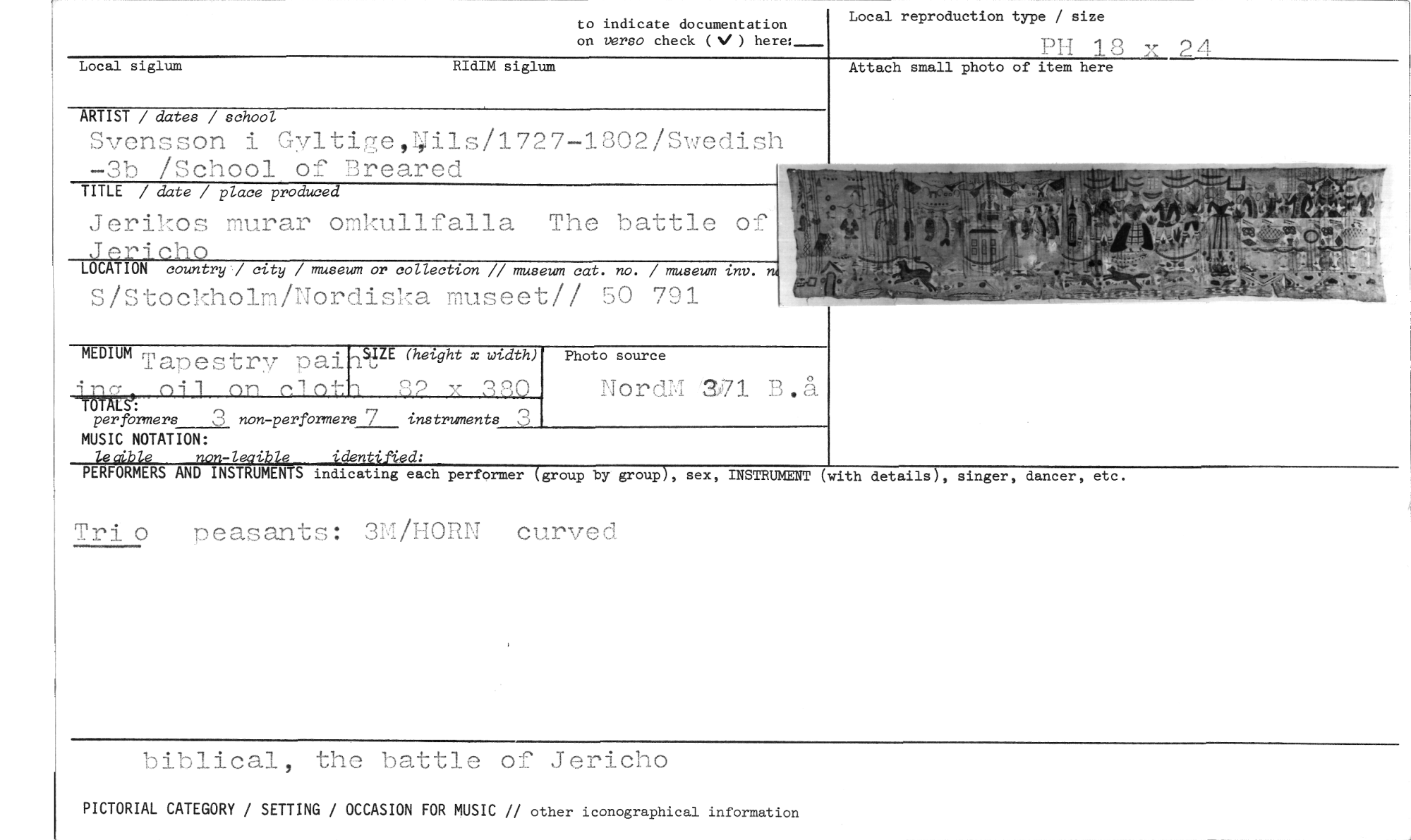 //// Local reproduction type / size //// PH 18 x 24 //// to indicate documentation //// on versa check (V) here:— //// Local siglum RIdIM siglum //// ARTIST / dates / school //// Svensson i Gyltirm,4ils/1727-1802/Swedish -3b /School of Breared //// TITLE / date / place produced //// Jerikos murar omkullfalla The battle o_ //// Jericho //// LOCATION country? city / museum or collection // museum cat. no. / museum 1.nv. //// S/Stockholm/Nordiska museet// 50 791 //// Attach small photo of item here //// MEDIUMTapestrvpain.T //// sazE (hel.ght x wtdth) Photo source //// itu-, ni 1 ön el 32 Y: 330 NordM 71 B.å //// TOTALS: //// per formers 3 non-peribrmers 7 instruments 3 //// MUSIC NOTATION: //// Dgfible non-lecible identified: //// PERFORMERS AND INSTRUMENTS indicating each performer (group by group), sex, INSTRUMENT (with details), singer, dancer, etc. //// Trio peasants: 3P/MORN curved //// biblical, the battle of Jericho //// PICTORIAL CATEGORY / SETTING / OCCASION FOR MUSIC // other iconographical information ////