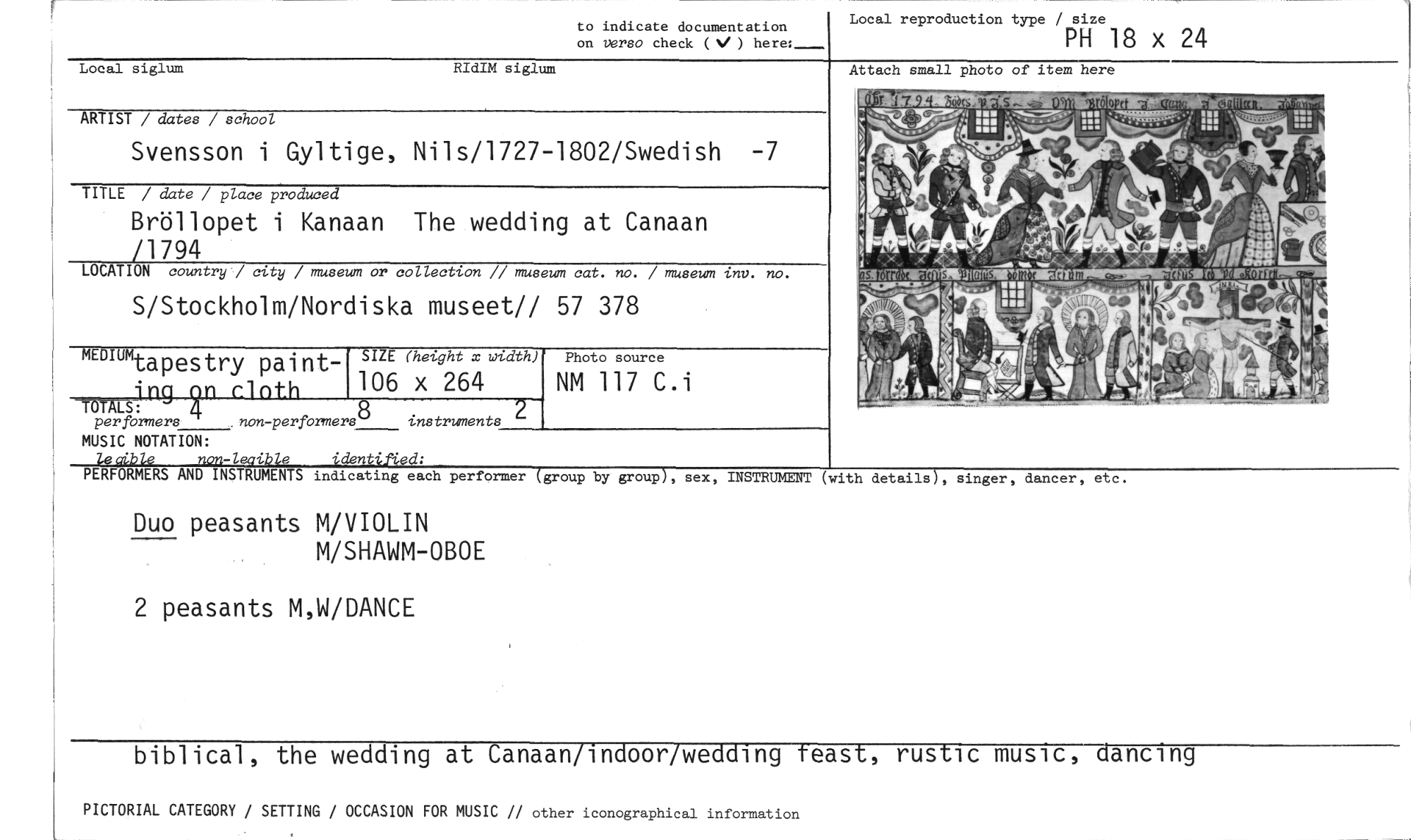 //// to indicate documentation //// on versa check ( ) here:_ //// Local reproduction type / size //// PH 18 x 24 //// Local siglum RIdIM siglum //// ARTIST / dates / school //// Svensson i Gyltige, Nils/1727-1802/Swedish -7 //// TITLE / date / place produced //// Bröllopet i Kanaan The wedding at Canaan //// /1794 //// LOCATION country / city / museum or collection // museum cat. no. / museum inv. no. //// S/Stockholm/Nordiska museet// 57 378 MEDIU mtapestry paint- //// III SI //// Te S: • //// per formers non-perfbrmers instruments //// MUSIC NOTATION: //// le aible non-legible identified; //// å //// SIZE (height x width) //// 106 x 264 //// Photo source //// NM 117 C.i //// Attach small photo of item here //// oas //// • //// • dan .451 //// ALM //// _ //// ":7110^4=0", rjr, //// Leger 110, //// Vit.: //// W //// Ok //// PERFORMERS AND INSTRUMENTS indicating each performer //// (group by group), sex, INSTRUMENT (with //// details), singer, dancer, etc. //// Duo peasants M/VIOLIN //// M/SHAWM-OBOE //// 2 peasants M,W/DANCE //// biblical, the wedding at Canaan/indoor/wedding teast, rustic music, dancing //// PICTORIAL CATEGORY / SETTING / OCCASION FOR MUSIC // other iconographical information ////