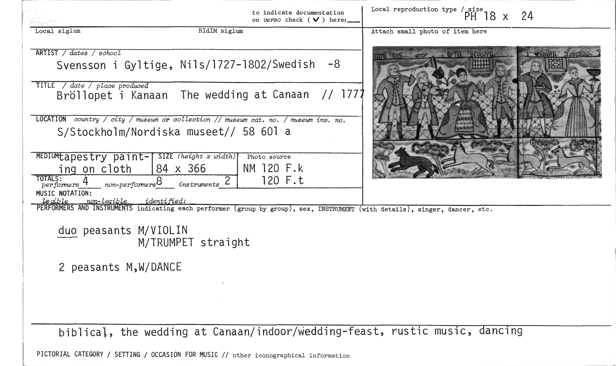 //// to indicate documentation //// on versa check ( ) here: //// Local reproduction type / size //// PH 18 x 24 //// Local siglum //// RIdIM siglum //// Attach small photo of item here //// ARTIST / dates / school //// Svensson i Gyltige, Nils/1727-1802/Swedish -8 //// TITLE / date / place produced //// Bröllopet i Kanaan The wedding at Canaan // 177 //// LOCATION country / city / museum or collection // museum cat. no. / museum inv. no. //// S/Stockholm/Nordiska museet// 58 601 a //// mm"a pestry paint- //// ing on cloth //// SIZE (height x width) //// 84 x 366 //// 0—rltS: //// per formers 4 non-perfonners8 instrzenents //// MUSIC NOTATION: //// aible non-leaib le identi fied: //// NM 120 F.k 120 F.t //// PERFORMERS AND INSTRUMENTS indicating each performer (group by group), sex, //// INSTRUMENT (with details), singer, dancer, etc. //// duo peasants M/VIOLIN //// M/TRUMPET straight //// 2 peasants M,W/DANCE //// biblicaT, the wedding at Canaan/indoor/Wedding-feast, rustic music, dancing //// PICTORIAL CATEGORY / SETTING / OCCASION FOR MUSIC // other iconographical information ////