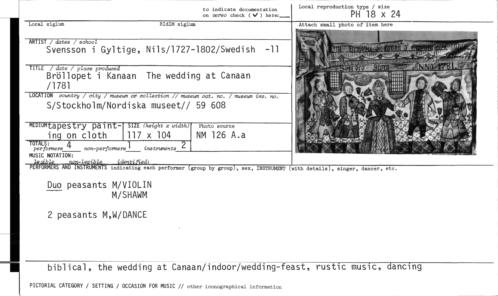 //// PH 18 x 24 //// to indicate documentation //// on verso check (N./ ) here: //// Local reproduction type / size //// ARTIST / dates / school //// Svensson i Gyltige, Nils/1727-1802/Swedish -11 //// TITLE / date / place produced //// Bröllopet i Kanaan The wedding at Canaan /1781 //// LOCATION country / city / museum or collection // museum cat. no. / museum tnv. no. //// S/Stockholm/Nordiska museet// 59 608 //// MEDIUM tapestry paint- SIZE (height x width) //// ing on cloth 117 x 104 //// per formers non-performers 1 instruments 2 //// MUSIC NOTATION: //// leaible non-leaible identified: //// PERFORMERS AND INSTRUMENTS indicating each //// Duo peasants M/VIOLIN //// M/SHAWM //// TOTALS: 4 //// Local siglum //// R dIM siglum //// Attach small photo of item here //// Photo source //// NM 126 A.a //// performer (group by group), sex, INSTRUMENT (with details), singer, dancer, etc. //// 2 peasants M,W/DANCE //// biblical, the wedding at Canaan/indoor/wedding-feast, rustic music, dancing //// PICTORIAL CATEGORY / SETTING / OCCASION FOR MUSIC // other iconographical information ////