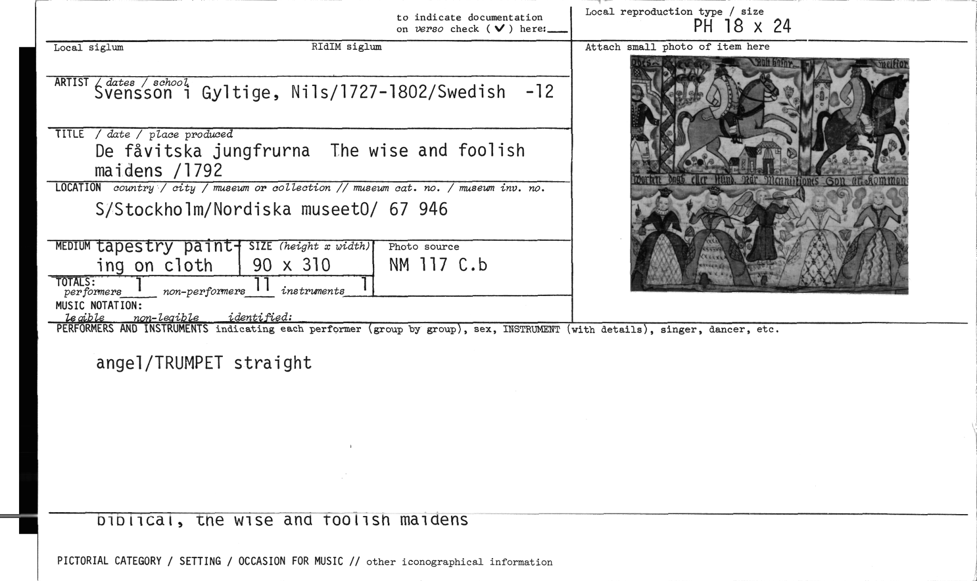 //// group), sex, INSTRUMENT //// (with details), singer, dancer, etc. //// MUSIC NOTATION: //// le aible non-legible identified: //// PERFORMERS AND INSTRUMENTS indicating each performer (group by //// RIdIM siglum //// Local siglum //// to indicate documentation //// on verso check ( ) here:- //// Local reproduction type / size //// PH 18 x 24 //// ARTIST dates / schoo4 //// Svensson 1 Gyltige, Nils/1727-1802/Swedish -12 //// TITLE / date / place produced //// De fåvitska jungfrurna The wise and foolish maidens /1792 //// LOCATION country / city / museum or collection // museum cat. no. / museum inv. no. //// S/Stockholm/Nordiska museet0/ 67 946 //// MEDIUM tapestry paint- //// ing on cloth //// SIZE (height x width) //// 90 x 310 //// TOTALS: //// per formers 1non-performers 1 1 instruments //// Attach small //// Photo source //// NM 117 C.b //// angel/TRUMPET straight //// oloticat, -me vilse ana 1-0011Sh malilens //// PICTORIAL CATEGORY / SETTING / OCCASION FOR MUSIC // other iconographical information ////