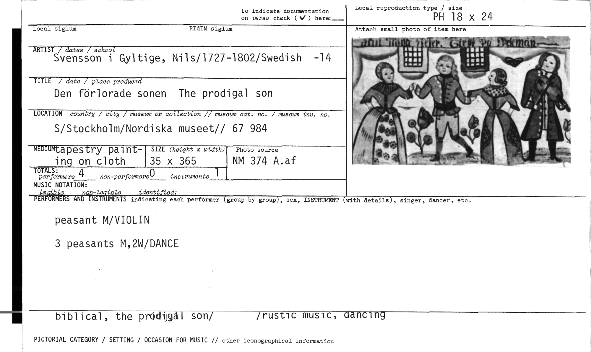 //// peasant M/VIOLIN //// 3 peasants M,2W/DANCE //// biblical, the prödijgäl son/ /rustic music, aancing //// PICTORIAL CATEGORY / SETTING / OCCASION FOR MUSIC // other iconographical information //// PH 18 x 24 //// to indicate documentation on verso check (4/ ) //// Local reproduction type / size //// MEM" apestry paint- //// ing on cloth //// SIZE (height x width) //// 35 x 365 //// Photo source //// NM 374 A.af //// 1-.i. e 'dent d. //// INSTRUMENTS indicating each performer //// group by group , sex, INSTRUMENT (with details , singer, dancer, etc. //// PERFORMERS AND //// Local siglum //// RIdIM siglum //// Attach small photo of item here //// ARTIST / dates / school //// Svensson i Gyltige, Nils/1727-1802/Swedish -14 //// TITLE / date / place produced //// Den förlorade sonen The prodigal son //// LOCATION country / city / museum or collection // museum cat. no. / museum ini,. no. //// S/Stockholm/Nordiska museet// 67 984 //// TÖTALS: //// perfbrmers A non-performers instruments 1 //// MUSIC NOTATION: ////
