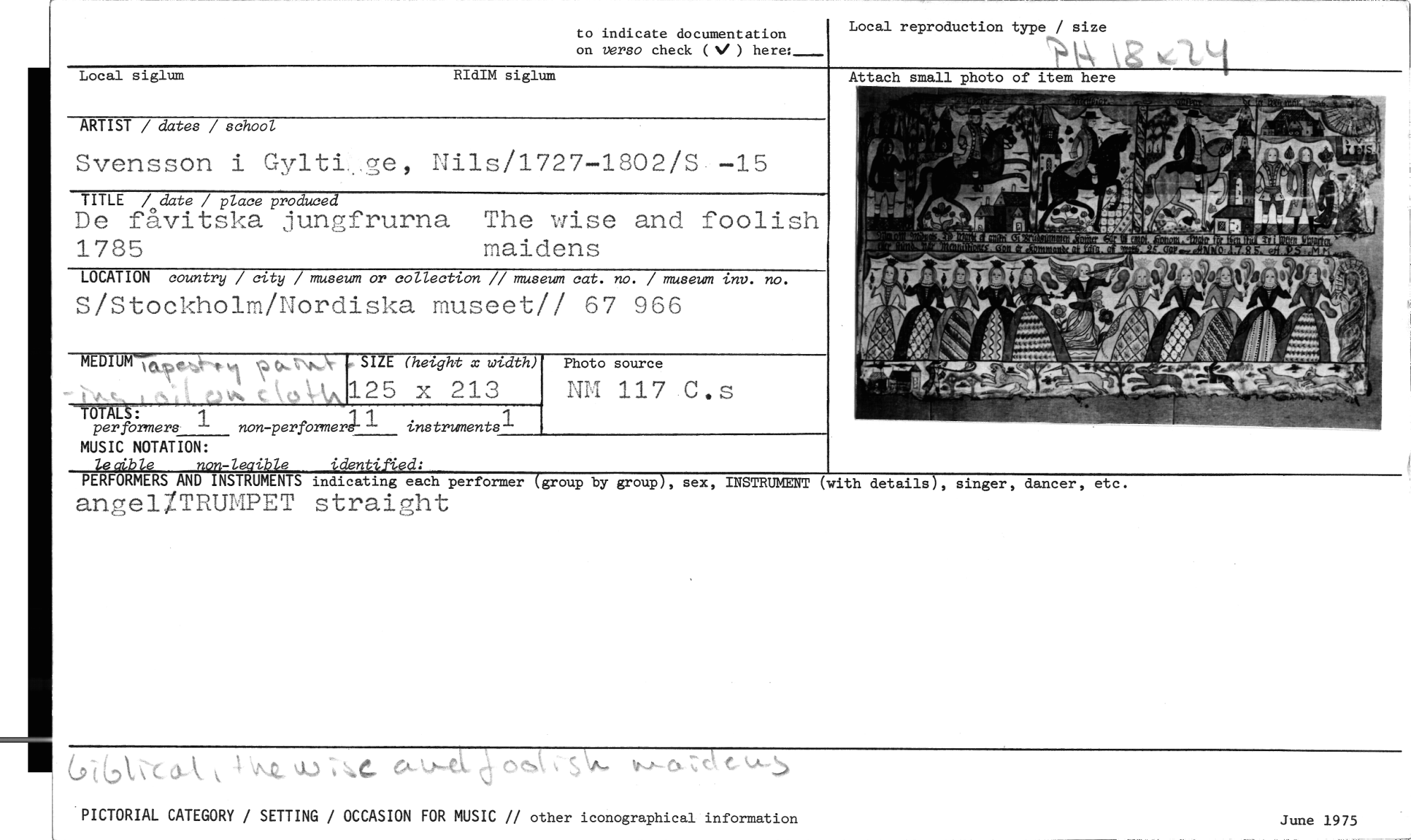 //// to indicate documentation on verso check ( ) here: //// Local reproduction type / size //// L //// Local siglum RIdIM siglum //// Attach //// ARTIST / dates / school //// Svensson i Gylti.ge, Nils/1727-1802/S -15 //// r 4.0 - //// arniM117411 11 - //// 11157110~1KMPer //// iWTJA1571TIWTIMUP7.772717,W=IL.,.4127 //// TITLE / date / place produced //// De fåvitska jungfrurna The wise and foolish 1785 maidens //// LOCATION country / city / museum or collection // museum cat. no. / museum inv. no. //// S/Stockholm/Nordiska museet// 67 966 //// MEDIUM ,e0,1104.4 544, 3.4,A //// -Å //// ,SIZE (hetght x width) //// 125 x 213 //// Photo source //// NM 117 C.s //// ALS: //// per formers non-per f onnerl 1 instruments1 //// MUSIC NOTATION: //// t' //// PE FORMERS AND INSTRUMENTS indicating each performer //// angel/TRUMPET straight //// dancer, et //// group by group , sex, INSTRUMENT (with details , singer, //// G-(61. -t 4 \Krt. kl) //// PICTORIAL CATEGORY / SETTING / OCCASION FOR MUSIC // other iconographical information //// June 1975 ////