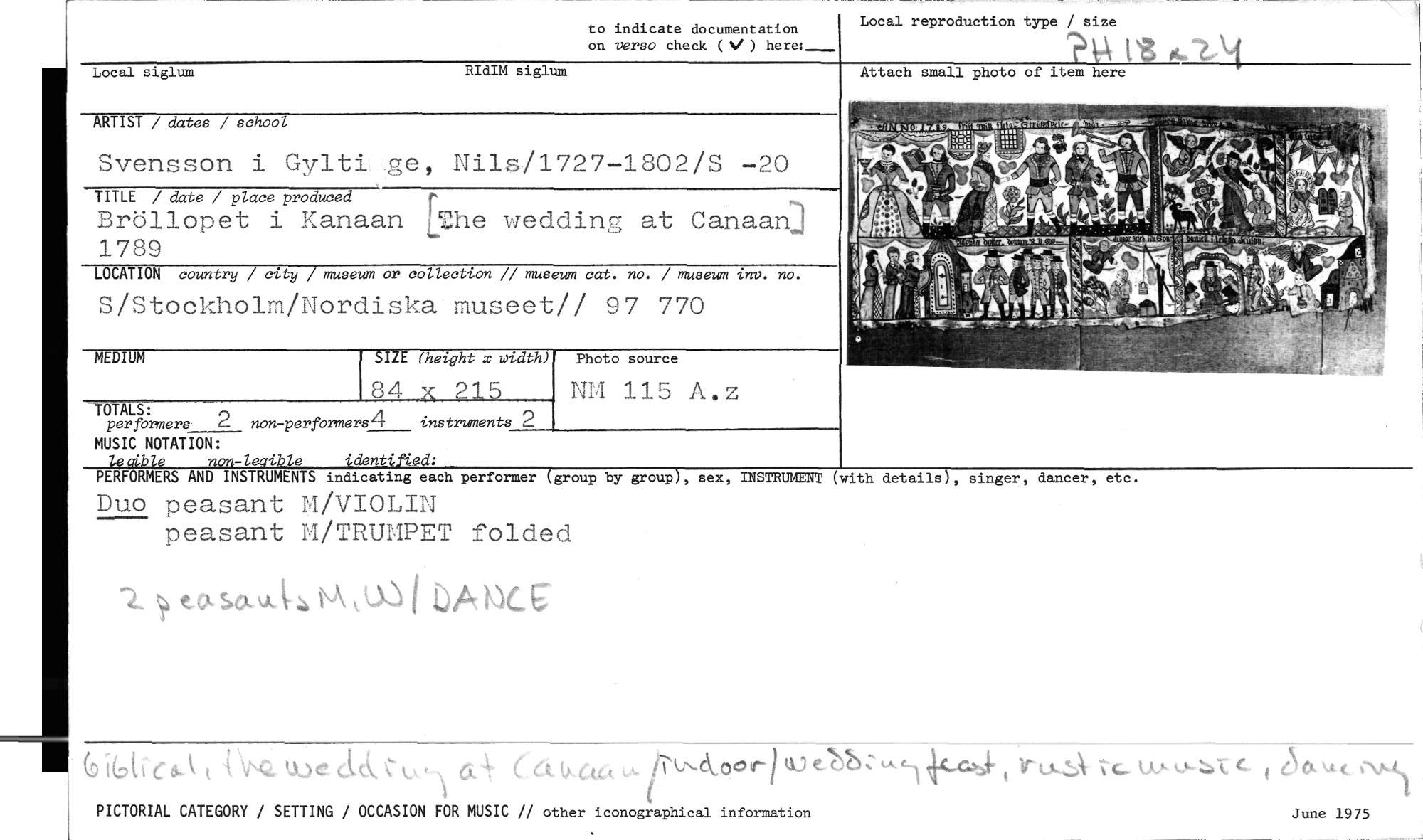 //// MEDIUM //// SIZE (height x width) //// 84 n 215 //// to indicate documentation //// on verso check (N/ ) here: //// Local siglum RIdIM siglum //// ARTIST / dates / school //// Svensson i Gylti Vie, Nils/1727-1802/S -20 //// TITLE / date / place produced //// Bröllopet i Kanaan [The wedding at Canaan 1789 //// LOCATION country / city / museum or collection // museum cat. no. / museum inv. no. //// S/Stockholm/Nordiska museet!! 97 770 //// Local reproduction type / size //// .ttach small photo of item here //// -TÖTALS: //// per formers 2 non-perfomers4 instruments 2 //// MUSIC NOTATION: //// le cible non-leaible identified; //// PERFORMERS AND INSTRUMENTS indicating each performer (group by group), sex, INSTRUMENT //// Duo peasant 14/VIOLIN //// peasant M/TRUMPET folded //// 2 tasaud- 0"/ I bAIK)c.9' //// :k .wA OM • //// ts //// (with details), singer, dancer, etc. //// år( i' e,..^ \is-Q ckc a. ( 46c, //// PICTORIAL CATEGORY / SETTING / OCCASION FOR MUSIC // other iconographical information //// (k) e,"bb //// CL 4( 11 June 1975 ////