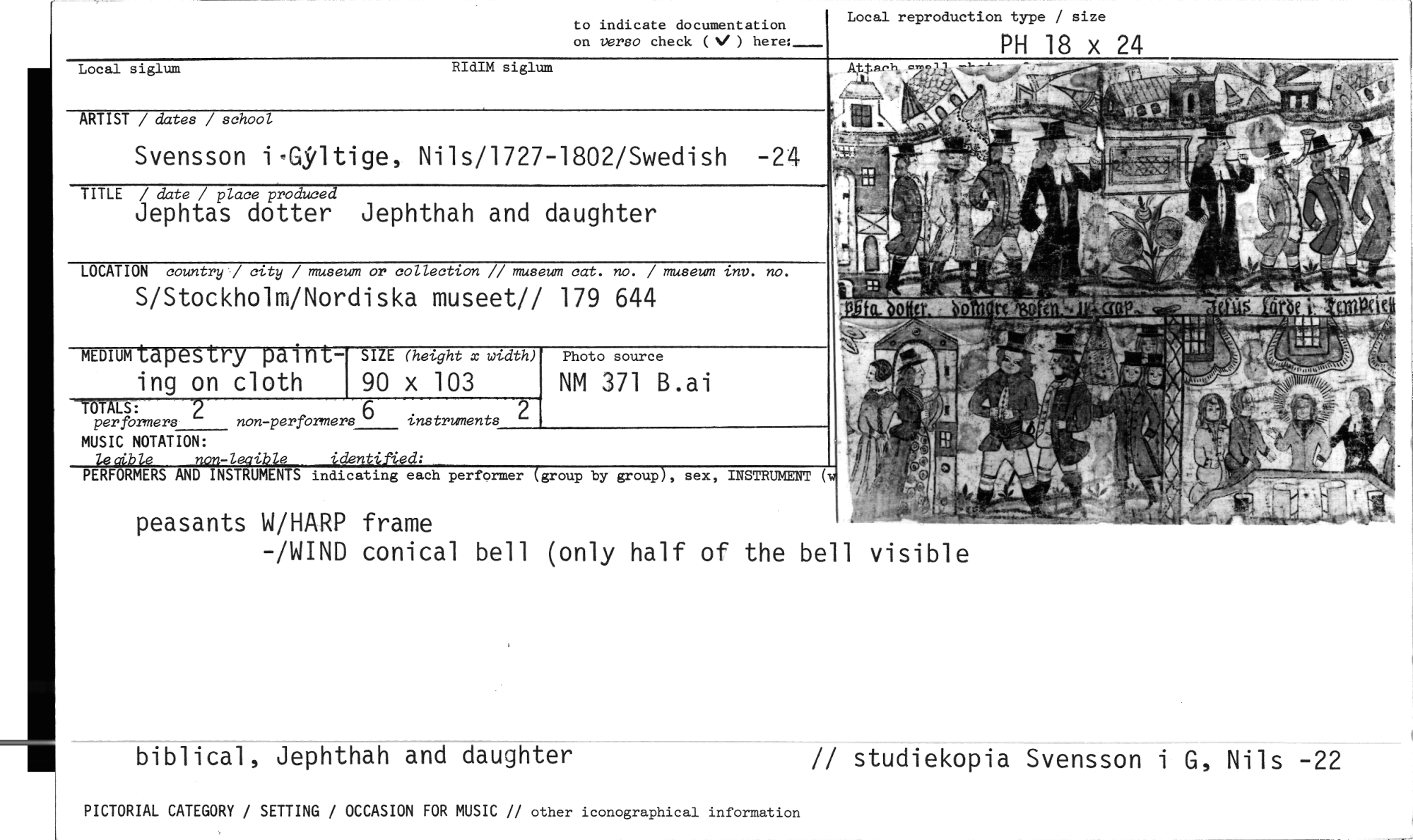 //// to indicate documentation //// on verso check ( ) here:__-_ //// Local reproduction type / size //// PH 18 x 24 //// Attaril //// RIdIM siglum //// Local siglum //// ARTIST / dates / school //// Svensson i,GYltige, Nils/1727-1802/Swedish -24 //// TITLE / date / place produced //// Jephtas dotter Jephthah and daughter //// LOCATION country / city / museum or collection // museum cat. no. / museum inv. no. //// ITIDOWEIE (te //// S/Stockholm/Nordiska museet// 179 644 //// MEDIUM tapestry paint- //// Photo source //// NM 371 B.ai //// ing on cloth //// TÖTALS: 2 //// per formers non-perfOrmers //// SIZE (height x wvdth) //// 90 x 103 //// instruments 2 //// MUSIC NOTATION: //// 4etible non-leaible identif4-04: //// PERFORMERS AND INSTRUMENTS indicating each performer (group by group), sex, INSTRUMENT //// peasants W/HARP frame //// -/WIND conical bell (only half of the bell visible //// biblical, Jephthah and daughter // studiekopia Svensson i G, Nils -22 //// PICTORIAL CATEGORY / SETTING / OCCASION FOR MUSIC // other iconographical information ////