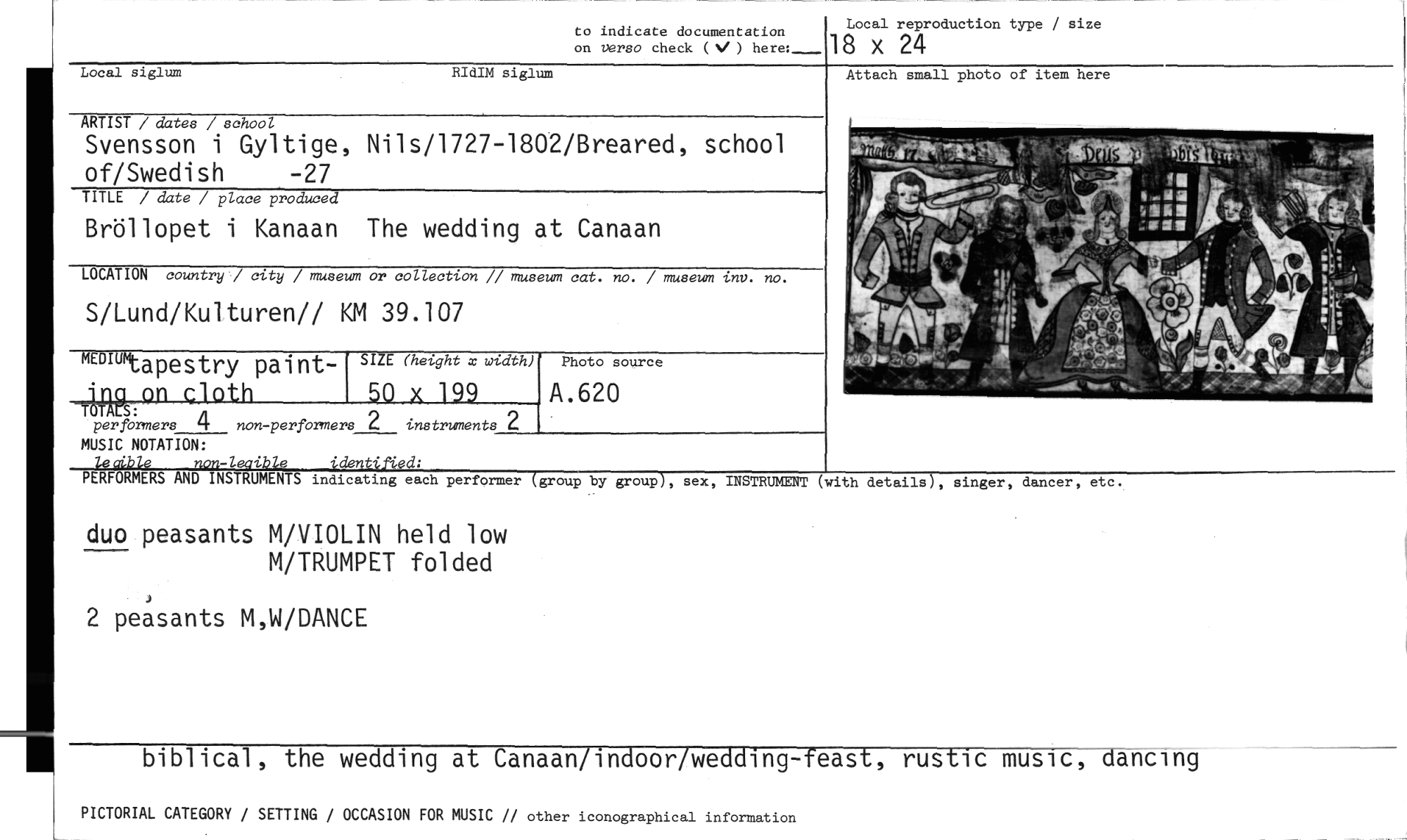 //// to indicate documentation Local reproduction type / size //// on Verso check (',./ ) here:_ 18 x 24 //// Local siglum RIdIM siglum //// Photo source //// A.620 //// ARTIST / dates / school //// Svensson i Gyltige, Nils/1727-1802/Breared, school of/Swedish -27 //// TITLE / date / place produced //// Bröllopet i Kanaan The wedding at Canaan //// LOCATION country / city / museum or collection // museum cat. no. / museum tnv. no. //// S/Lund/Kulturen// KM 39.107 //// ~11— 4 cloth //// perfbrmers non-performers 2 instruments 2 //// MUSIC NOTATION: //// ledble non-leaible identified; //// PERFORMERS AND INSTRUMENTS indicating each performer(group by group), sex, INSTRUMENT (with //// duo peasants M/VIOLIN held low //// M/TRUMPET folded //// MEDIUml-- //// -Lapestry paint- SIZE (height x width) //// 50 x 199 //// 2 peasants M,W/DANCE //// biblical, the wedding at Canaan/indoor/wedding-feast, rustic music, dancing //// PICTORIAL CATEGORY / SETTING / OCCASION FOR MUSIC // other iconographical information //// Attach small photo of item here //// details), singer, dancer, etc. ////